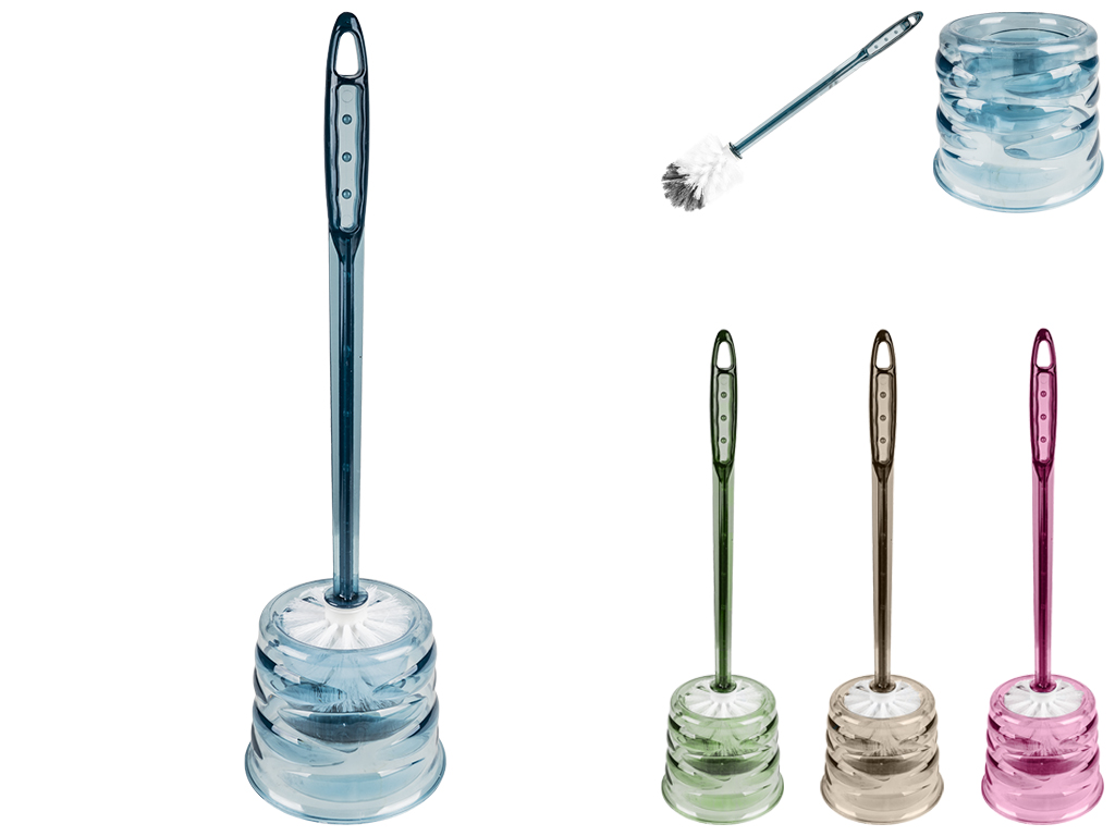 Туалетный набор: ершик для унитаза с подставкой прозрачный. Длина ершика: 44,5см. Диаметр: 8см. Размер подставки: 13,5х11х11см. Размер набора: 13,5х11х47см. Материал: пластмасса. Цвета: синий, розовый, серый, зеленый. Удобная форма ручки ершика с откручивающейся щеткой. Подставка конусной формы.