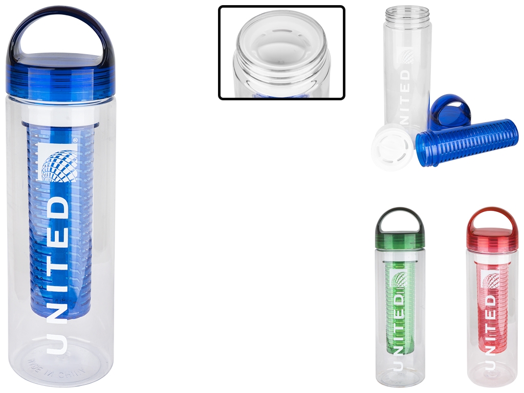 Размер: 7х7х25см, диаметр емкости: 7см. Объем: 750мл. Материал: пластмасса. Цвета: ассорти. Крышка с винтовой резьбой с уплотнителем. Бутылка оснащена фильтром, размер: 6х6х16,5см. Поверхность емкости полупрозрачная. Упаковка: пакет.
