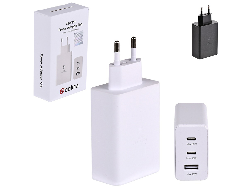 Сетевое зарядное устройство SOLMA PD «Trio» USB-C 65W/USB-C 25W/USB-A 15W это универсальный адаптер, разработанный для безопасной зарядки смартфонов, планшетов, повербанков, гарнитур и других портативных гаджетов. Материал: пластик, металл. Упаковка: цветная коробка.