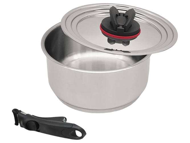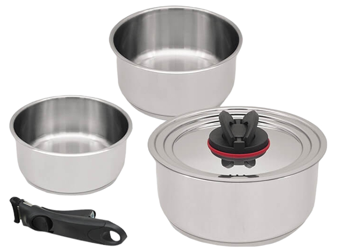 Многофункциональный 5-ти предметный набор посуды: кастрюля 1,3л (16х7см); кастрюля 1,9л (18х8см); кастрюля, 2,7л (20х9см); крышка из нержавеющей стали со складной бакелитовой ручкой; съемная ручка с фиксатором на кнопке, материал: бакелит. Крышка и съемная ручка универсальны, подходят ко всем предметам набора. Высококачественная нержавеющая сталь. Многослойное термоаккумулирующее дно. Возможно использование на всех типах плит. Экологически чистые материалы.