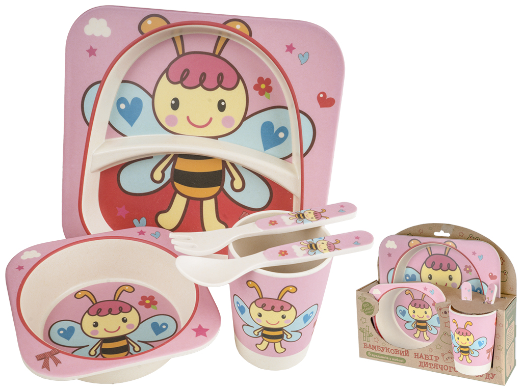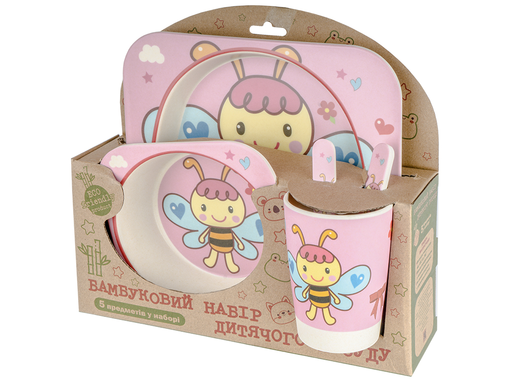 Набор детской бамбуковой посуды 5 предметов Stenson Пчелка (2 тарелки, вилка, ложка, стакан)