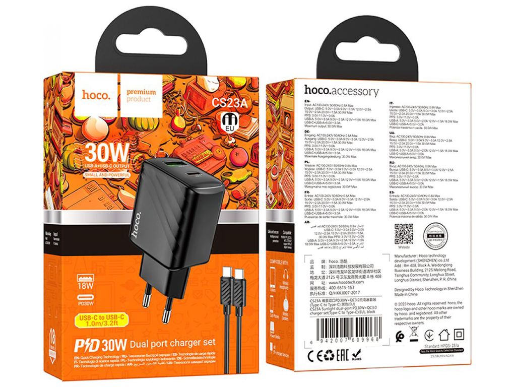 Комплектация: СЗУ Hoco CS23A, кабель Type-C - Type-C;