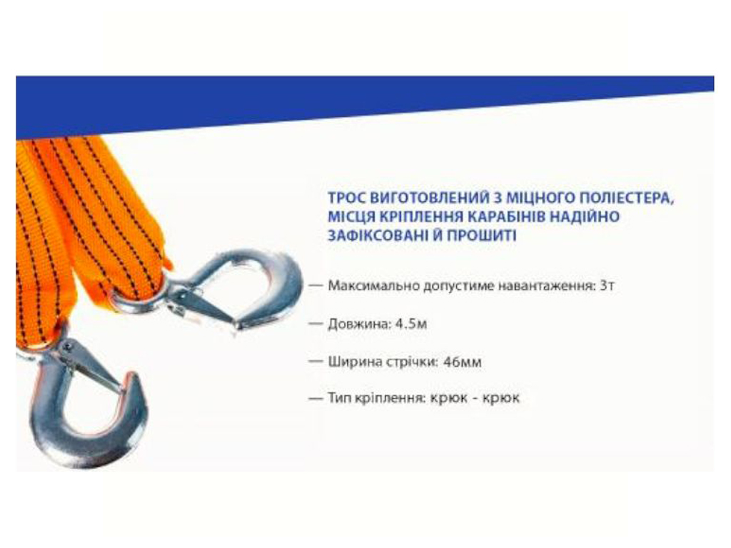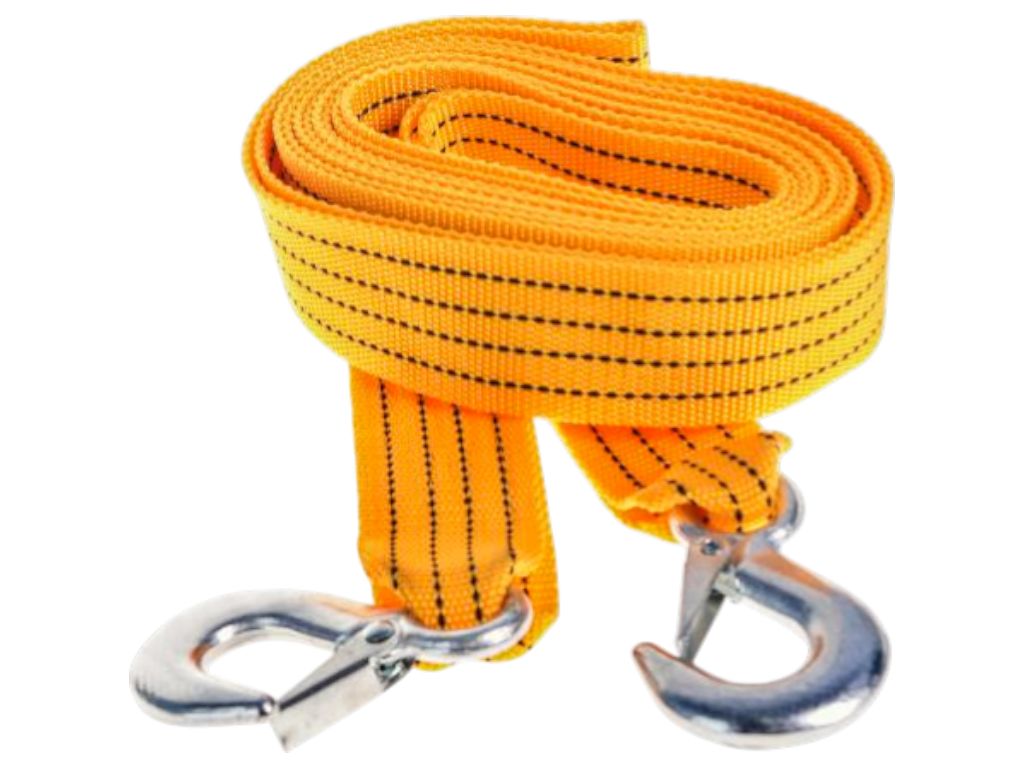 Трос буксировочный ST205/TP-205-3-1 3т лента 46мм х 4,5м желтый/крюк/блистер 80059 подходит для буксировки легковых автомобилей: ВАЗ, LADA, KIA, Hyundai. Буксировка автомобилей осуществляется за счет троса, изготовленного из прочных полиэстеровых нитей высокой плотности, благодаря технологии производства при рывках трос не рвется, а растягивается.