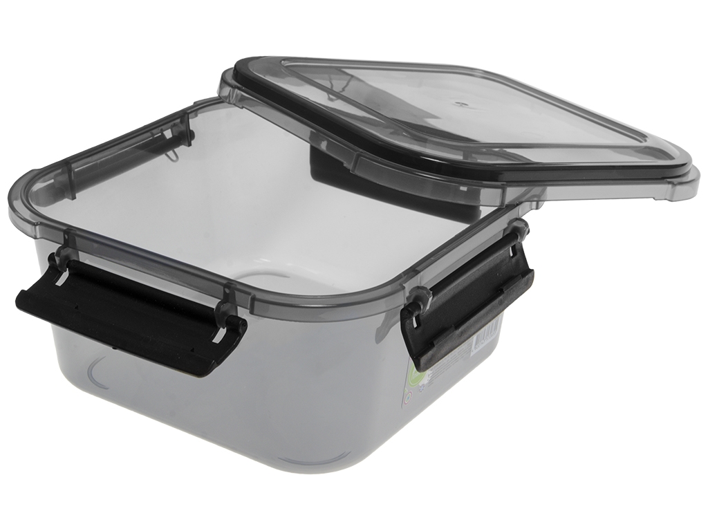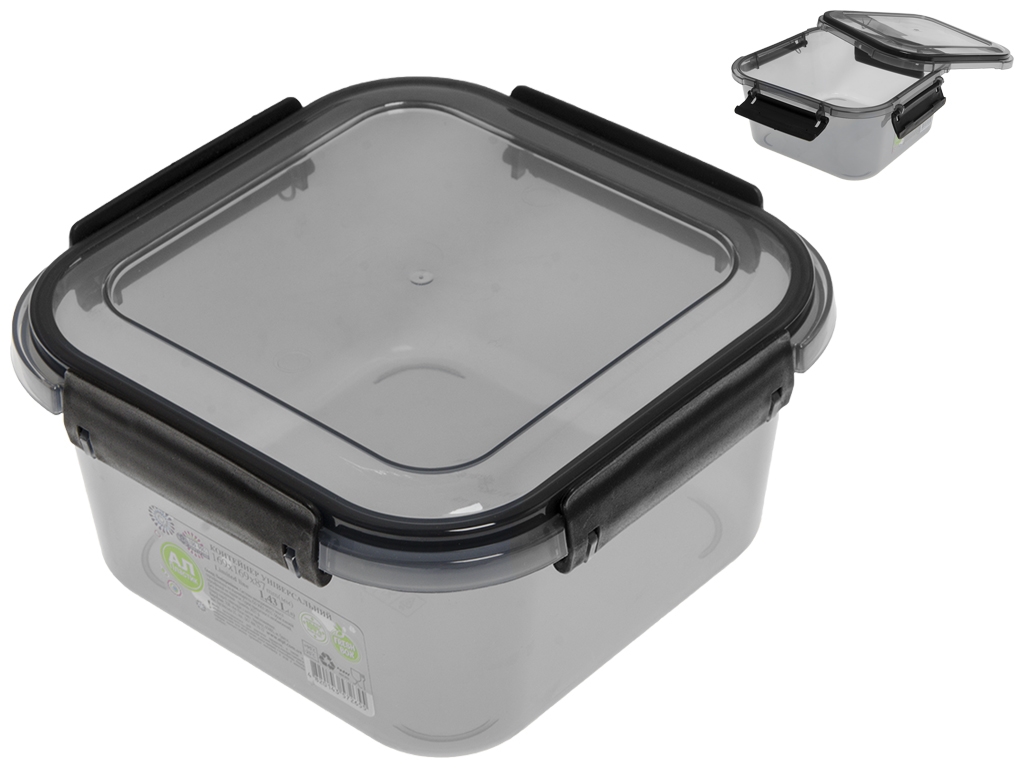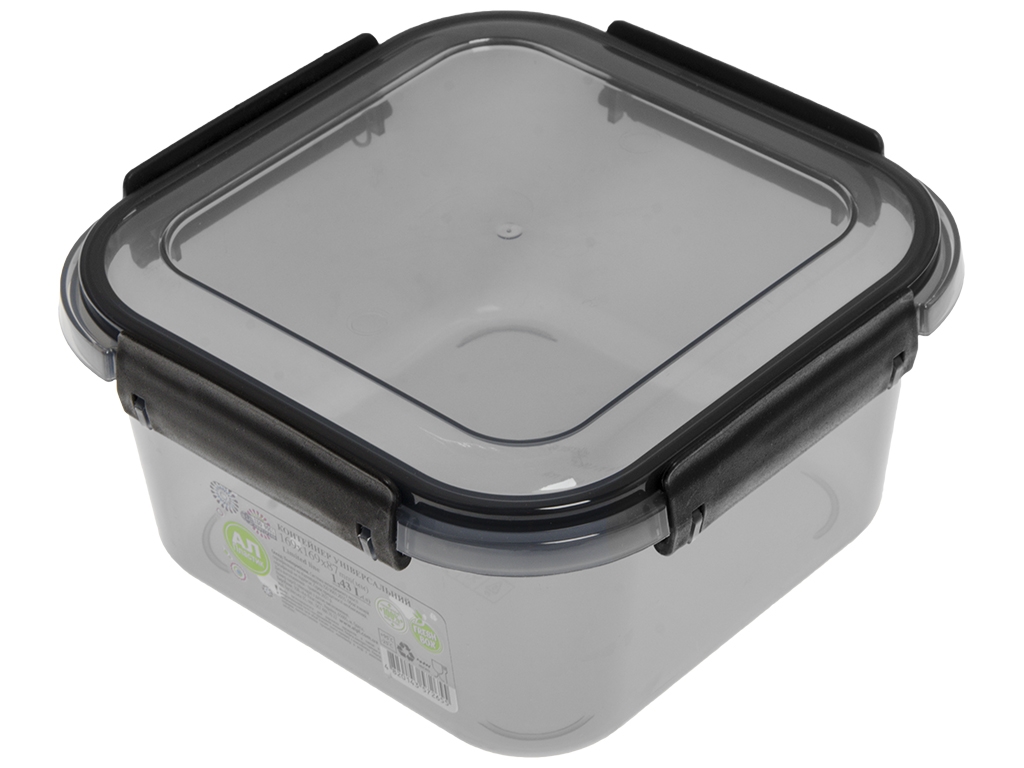 Размер контейнера: 16,9х16,9х8,7см . Объем: 1,43л. Материал: полипропилен. Крышка закрывается на замки защелки с 4 сторон. Для плотного закрытия крышка оснащена силиконовым уплотнителем. Контейнер прозрачный слегка окрашен пищевым красителем темного цвета. Контейнер предназначен для пищевых продуктов и организации хранения. Без упаковки.
