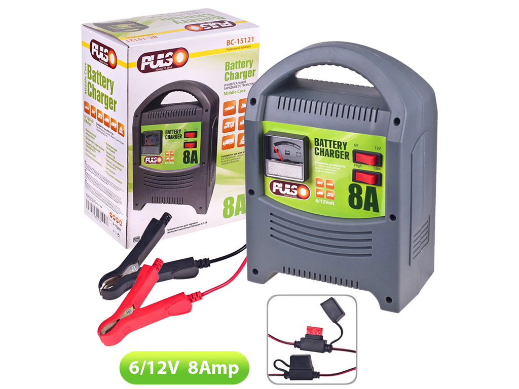 Зарядное устр-во PULSO незаменимый и надежный помощник. Светодиодная индикация позволяет контролировать уровень заряда. Защита от короткого замыкания и перегрева. Дисплей: стрелочный амперметр Емкость АКБ: 9 -112А/ч Мощность: 64 Вт Номинальный ток: 6/8 А Выходное напряжение: 6 В/12 В Частота: 50 Гц Входное напряжение 230-240 В Зарядный провод: 1,4 м с клеммами Ручка регулировки силы тока.