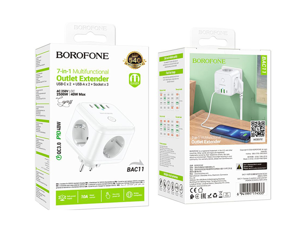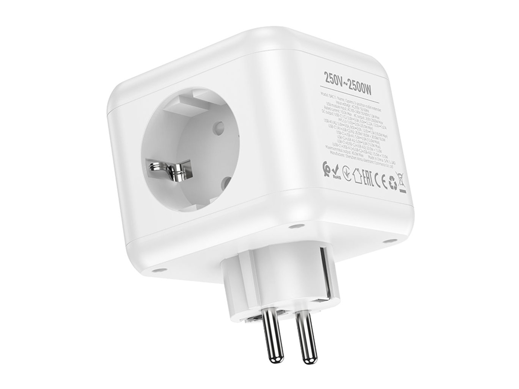 Сетевой удлинитель Borofone BAC11, PD 40 ватт, 2 порта USB и Type-C, цвет белый