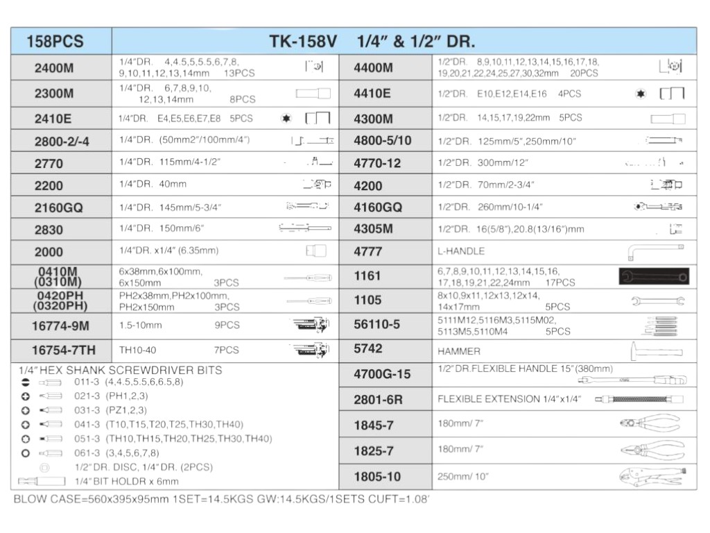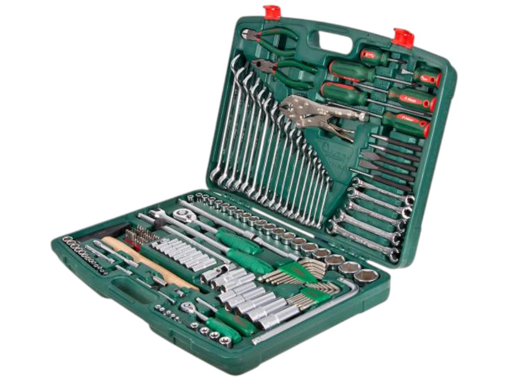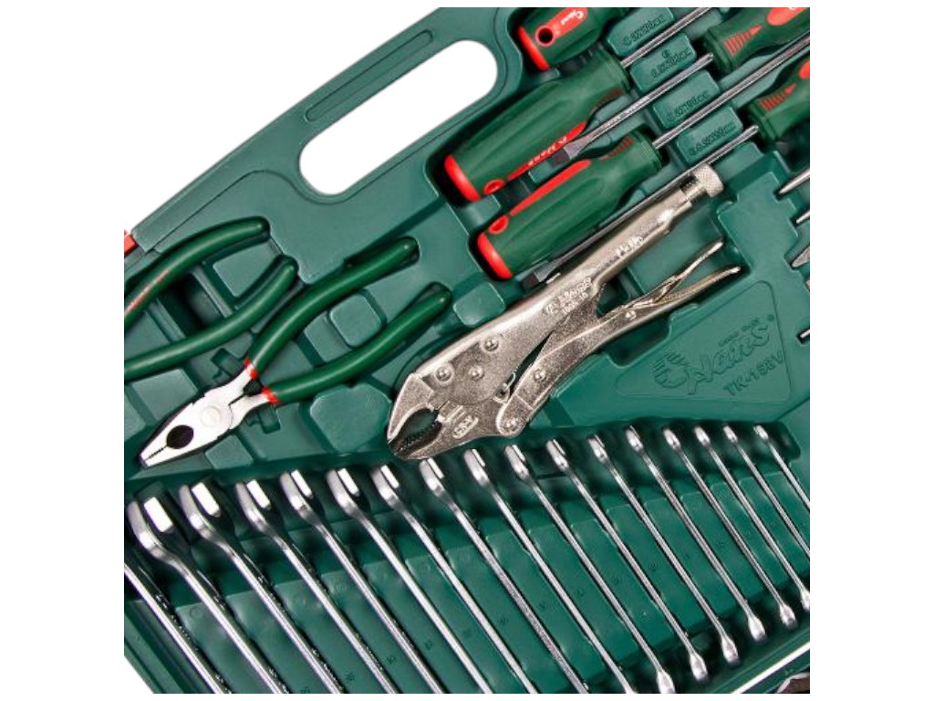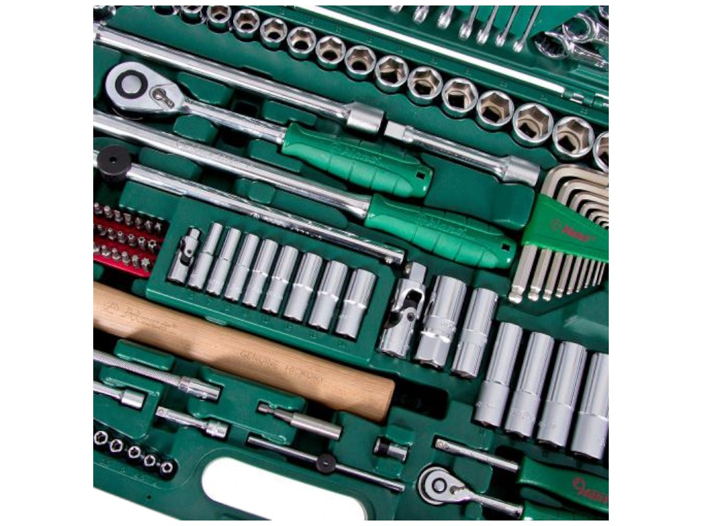 Набор инструмента HANS TK-158V, 158 предметов, 1/4" и 1/2" — универсальный профессиональный комплект для автосервиса, механических и монтажных работ. Этот набор создан для мастеров, которым важно иметь под рукой широкий ассортимент инструментов, подходящих для разных задач — от обслуживания автомобиля до сборки сложных механизмов. Всё аккуратно размещено в прочном пластиковом кейсе с надёжными замками и удобной ручкой для переноски. Каждый элемент выполнен из высококачественной инструментальной стали с хромированным покрытием, устойчивым к износу, коррозии и механическим воздействиям. Геометрия всех деталей точная, что гарантирует плотное прилегание к крепежу и снижает риск срыва граней.
