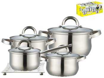 Количество предметов: 9. Подставка под горячее. Кастрюля с крышкой D18см 2л. Кастрюля с крышкой D24см 5л. Кастрюля с крышкой D20см 3л. Ковш с крышкой D16см 1,5л. Многослойное термоаккумулирующее дно. Материал: высококачественная нержавеющая сталь.