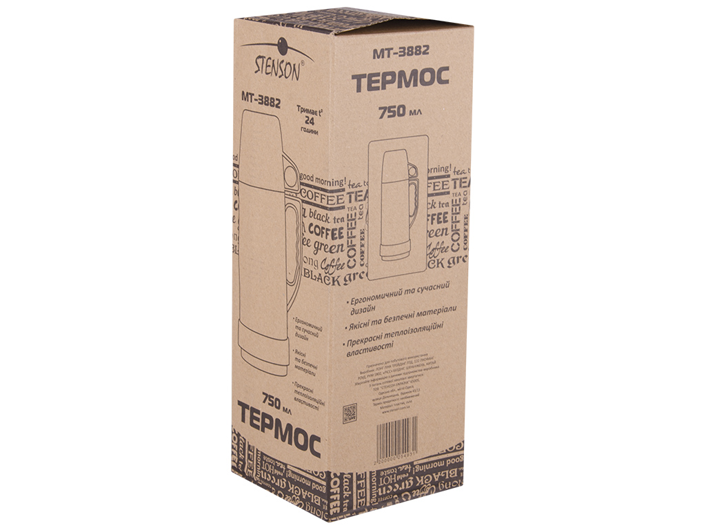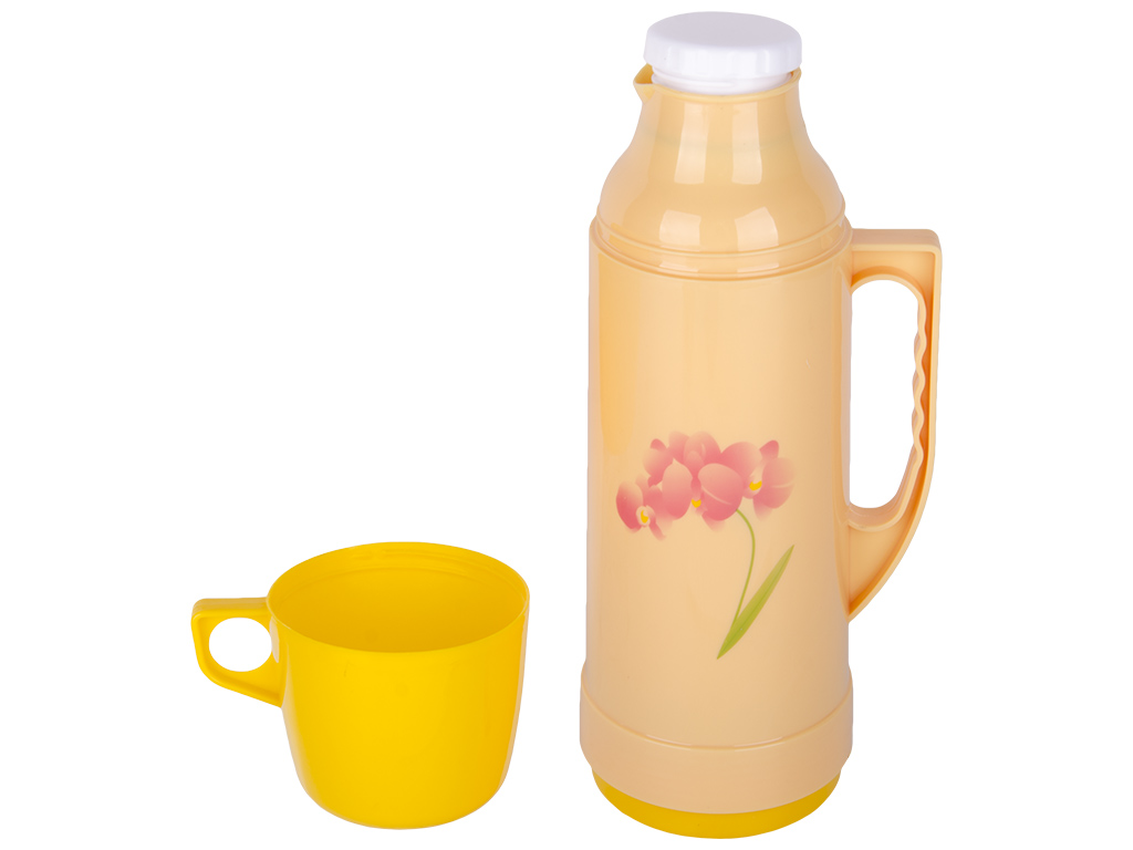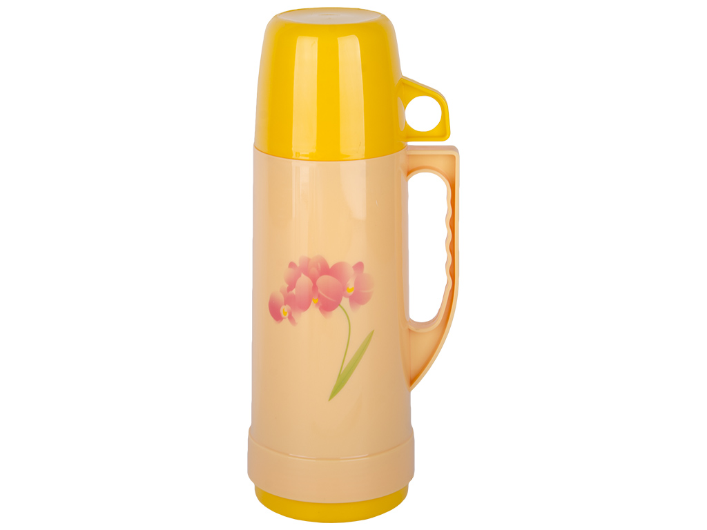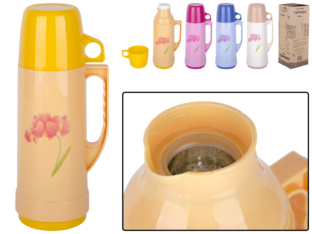 Объем: термос 750мл, крышка-чашка 350мл. Размер: 13,2х10,4х29,8см. Упаковка: коробка Kraft 11х11х30,7см. Материал: пластмасса - корпус, крышка, пробка; стекло - колба. Цвета: синий, розовый, бежевый, желтый. Термос закрывается винтовыми пробкой и крышкой. Крышка оборудована ручкой и ее можно использовать в качестве чашки. Корпус термоса оснащен ручкой для переноски. Внутренняя колба выполнена из стекла. Наличие термостойкого стекла позволяет обеспечить более долгое время температурного режима. Так же материал не впитывает в себя вкусовые качества напитков, что является значительным плюсом.