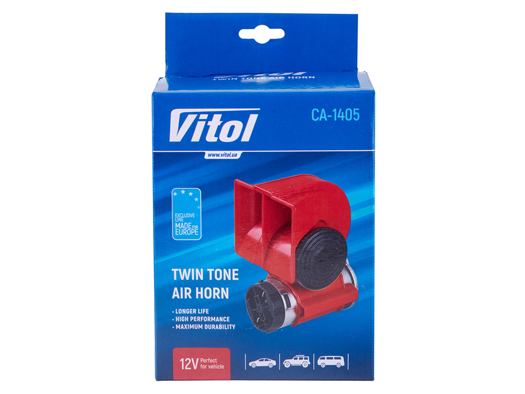 Сигнал пневматический VITOL, CA-1405, 12V, красный - мощный и надёжный автомобильный сигнал с двухтональным звучанием (115-139 дБ, 530/680 Гц), обеспечивающий отличную слышимость даже в плотном транспортном потоке. Работает от сети 12V с током до 20 А. Встроенный компрессор обеспечивает автономную работу без дополнительных систем. Корпус красного цвета в форме "улитки" имеет компактные размеры (145×110 мм), легко монтируется в ограниченном пространстве, устойчив к пыли, влаге и вибрациям. Идеален для легковых авто, мотоциклов, квадроциклов и грузовиков. В комплект входят сигнал, крепления, реле подключения, инструкция и упаковка VITOL. Продукт сертифицирован и соответствует техническим регламентам.