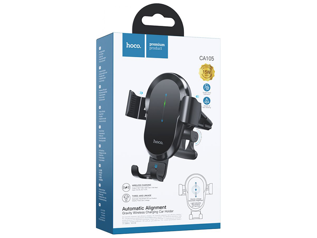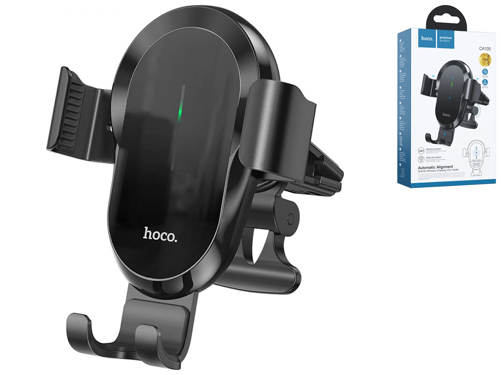 Hoco CA105 wireless - это практичный автомобильный держатель, который предназначен для смартфонов с диагональю экрана 4.7-7.0' и дополнен функцией беспроводной зарядки гаджетов, поддерживающих технологию Qi. Модель выделяется привлекательным внешним видом, исключительной надежностью и простотой в эксплуатации. Она лаконично впишется в интерьер любого современного автомобиля и предоставит возможность легко, всего одной рукой установить смартфон для его безопасного, максимально комфортного использования. Аксессуар качественно собран, изготовлен из акрила и стойкого к повышенным нагрузкам поликарбоната. Отполированные до блеска и текстурированные детали подчеркивают его изысканный дизайн и обеспечат приятные тактильные ощущения. Модель оснащена раздвижной системой с механизмом гравитационного типа, боковые фиксаторы которой захватывают смартфон при воздействии его собственного веса на нижнюю подставку. Минимальная ширина захвата равна 62мм, максимальная - 88мм. Мощность на выходе беспроводной зарядки автоматически регулируется в зависимости от потребностей смартфона и может составлять 5W, 7.5W, 10W и 15W (мощность 15W доступна лишь для некоторых моделей смартфонов LG). Встроенный LED индикатор поможет контролировать работу зарядки, а разъем Type-C - подключить её к источнику питания с исходящей силой тока 2A при напряжении 5V и 1.67A при напряжении 9V. Крепление держателя совместимо с большинством типов вентиляционных решеток и соединено с его основной частью шарниром, позволяющим регулировать поворот смартфона на все 360° вокруг его оси.
