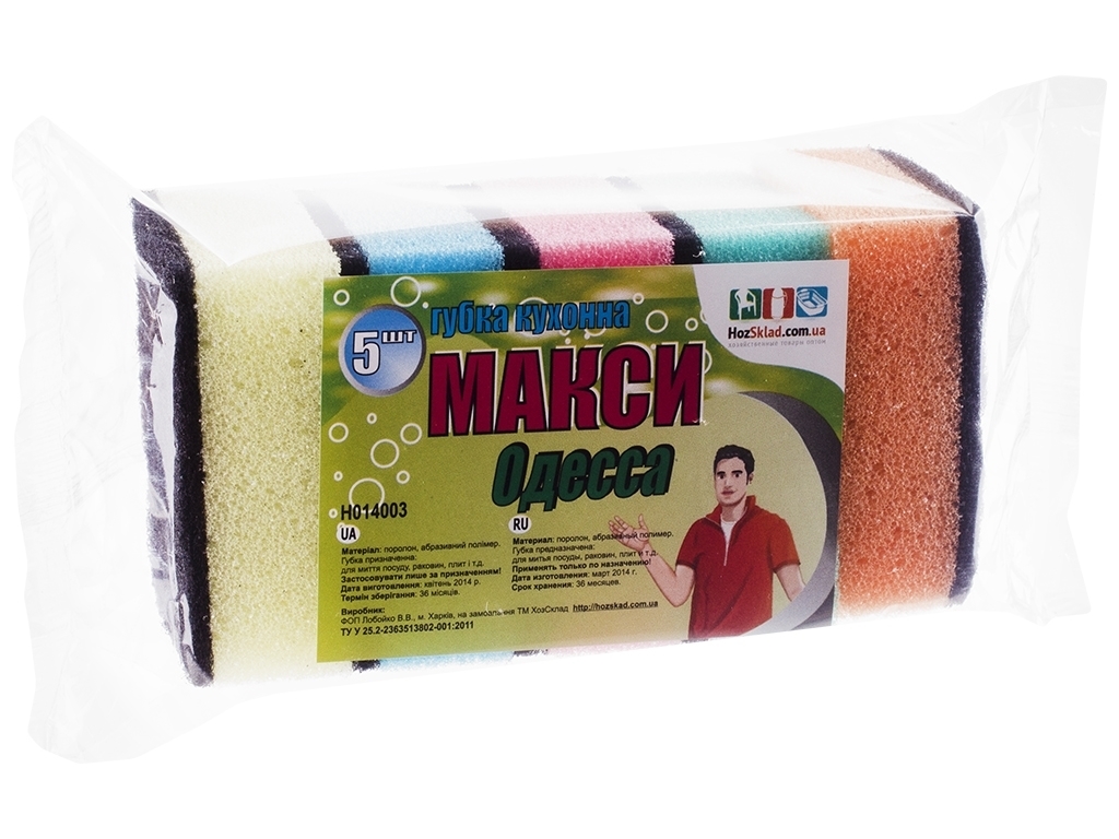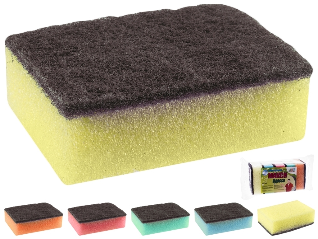 Набор губок кухонных "Макси" 5шт. Размер: 9x6см. Цвет: ассорти. Материал: пенополиуретан, абразивная фибра. Предназначены для мытья посуды, раковин, бытовой техники, кафеля и кухонной мебели, различного оборудования. Прекрасно впитывают влагу. Экономят затраты и обеспечивают хорошее вспенивание моющего средства. Абразивная фибра очищает сильно загрязненные участки без повреждений посуды, а поролоновый слой позволяет мыть деликатные поверхности.