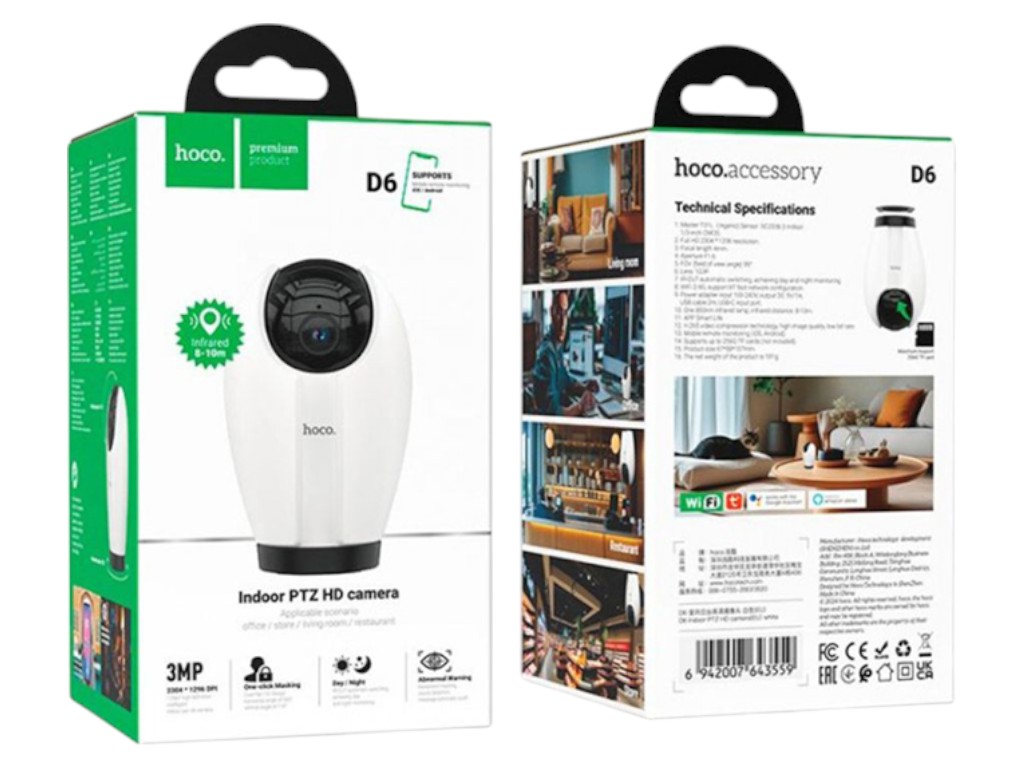 Компактная HD-камера Hoco D6 с разрешением 3MP обеспечивает полный видеоконтроль в помещении. Она поддерживает поворот, ночную съёмку, голосовую связь и управление через приложение Smart Life.