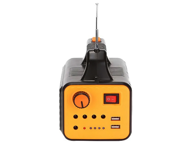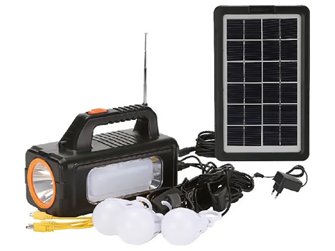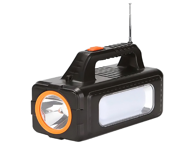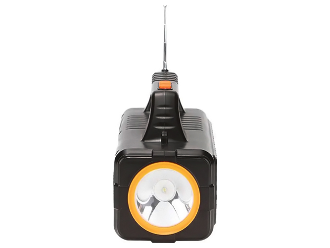 Фонарик светодиодный. Особенности: Bluetooth, MP3, радио. Питание: аккумулятор на солнечной панеле. Емкость аккумулятора: 9000мА. Размер: 28x22см.