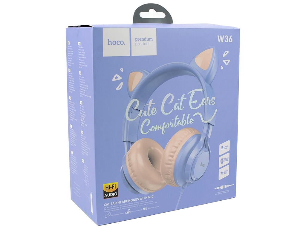 Наушники Hoco W36 – практичное устройство, оригинальная реализация которого, несомненно, приведет в настоящий увлечение ребенка и взрослого. Данная модель имеет небольшой вес и практичную конструкцию, выполнена в необычном двухцветном дизайне с кошачьими ушками, имеющими привлекательные глянцевые детали. Для изготовления аксессуара используются современные электронные компоненты и прочный, устойчивый к нагрузкам пластик с приятной поверхностью. Мягкие амбушюры, обшитые экокожией, плотно прилегают к ушам, не создавая дискомфорт даже при многочасовой эксплуатации гарнитуры и защищая от посторонних шумов. Сложные ушные элементы значительно упростят хранение и транспортировку наушников, сделав его более безопасным. Модель снабжена широкополосными динамиками, передающими оригинальный звук в качестве Hi-Fi, встроенным кабелем с одной точкой крепления, оснащенным стандартным разъемом Mini-Jack 3.5мм, пультом с многофункциональной кнопкой и чувствительным микрофоном. Длина кабеля – 1м.