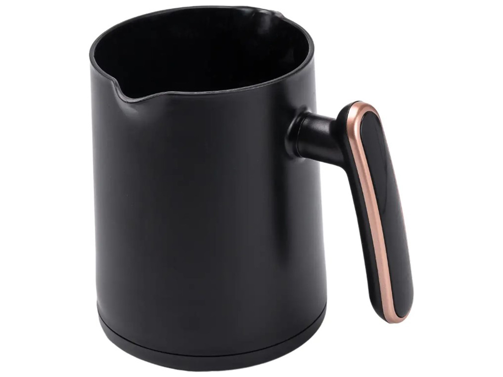 Электрическая турка это отличный вариант для небольшой кухни или офиса. Устройство позволяет готовить до 4 чашек кофе за раз, отличается привлекательным дизайном и компактными размерами, а простой принцип работы не требует особых знаний и навыков. Для приготовления кофе не понадобятся специальные капсулы и фильтры для кофеварки. Все что нужно - засыпать в турку кофе и залить водой. Жидкость не переливается через края турки, а устройство автоматически выключается после закипания. Автоматическое выключение при достижении температуры 96°C. Кофеварка выполнена из нержавеющей стали и имеет антипригарное покрытие, что облегчает очистку после использования. Материал корпуса: пластик. Мощность: 600Вт. Длина сетевого шнура: 55см. Высота: 24см.