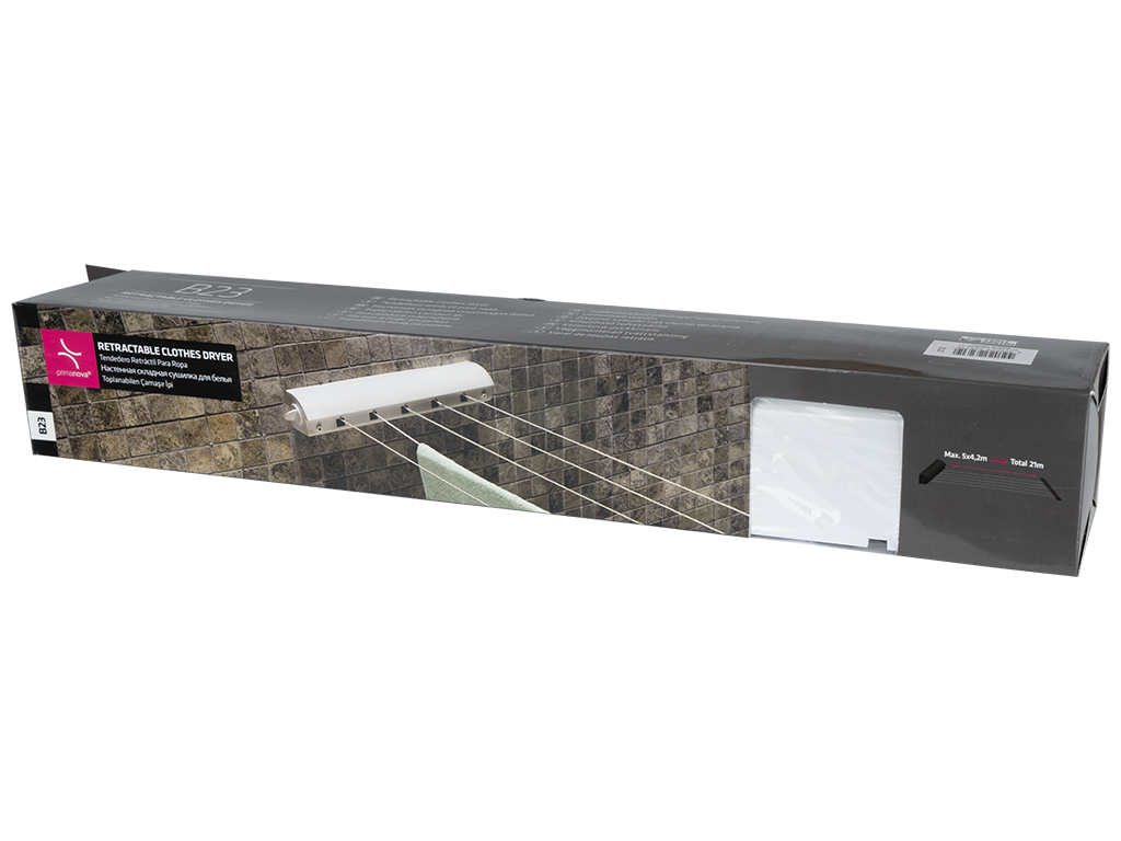 Транспортировочный размер: 48x8x7,5см. Длина веревок: 4,2м. Количество веревок: 5шт. Размер крепления: 45x7x7,2см. Материал: пластмасса. Цвет: белый. Данное приспособление можно надежно зафиксировать на балконе, в ванной, в саду или прямо в комнате, что позволит забыть о проблеме с мокрыми вещами. Если в устройстве нет необходимости, его можно просто снять и спрятать в кладовке.