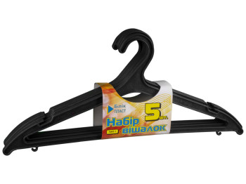 Вешалка для одежды большая ОлексПласт "Тип 1". Размер тремпеля: 45,8х1х19,5см. Количество штук в наборе: 5. Материал: пластик. На перекладине два крючка. Цвет: черный.
