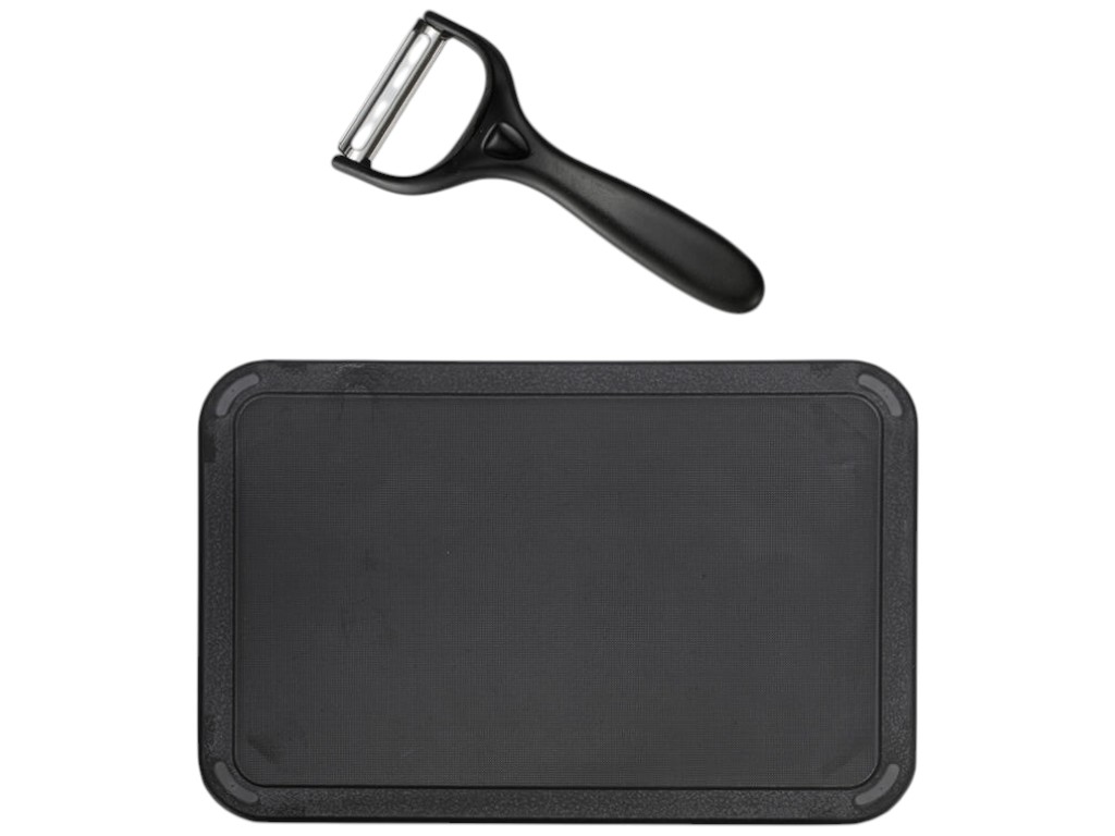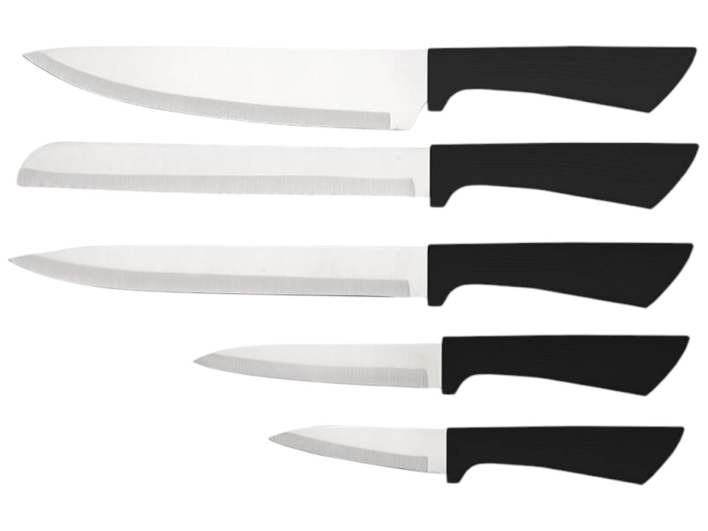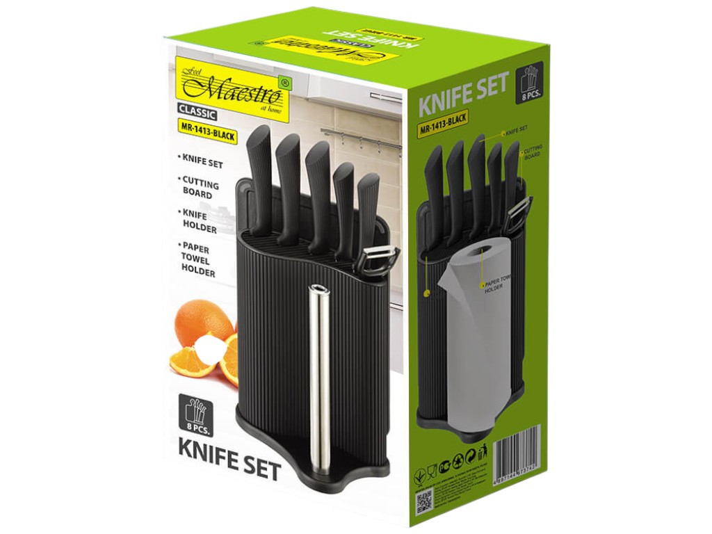 Набор ножей Maestro создан для ежедневной работы на кухне. В комплект входят пять ножей различного назначения, овощечистка, разделочная доска и подставка с держателем для бумажных полотенец. Такой набор подходит для нарезки мяса, хлеба, овощей и фруктов, а также для быстрого выполнения мелких кулинарных задач. Лезвия изготовлены из нержавеющей стали, сохраняющей остроту даже при частом использовании. Рукоятки выполнены из прочного пластика с рифлёной поверхностью, что снижает скольжение при работе. Подставка удерживает ножи вертикально и помогает поддерживать порядок на рабочем столе.