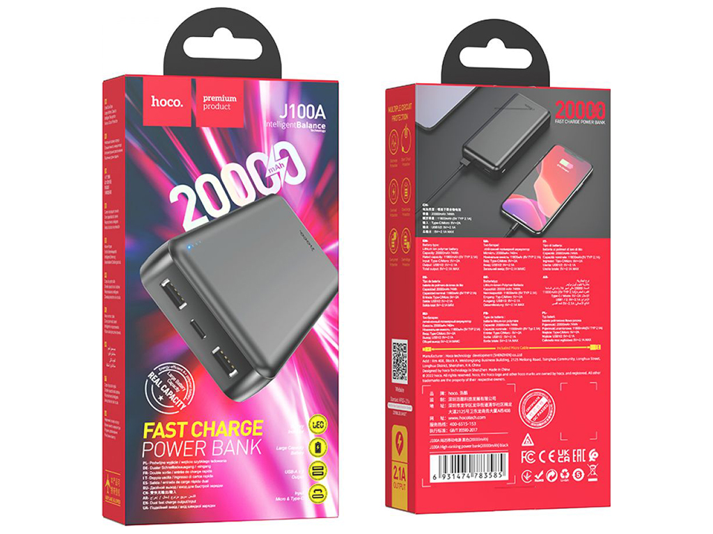 Тип зарядки: Проводной; Индикатор заряда: LED индикатор; Сила тока на разъемах, А: 2.1 A при 5V; Способ определения уровня емкости: Механический; Быстрая зарядка: Fast Charging; USB порты: 4; Емкость аккумулятора, mah: 20000; Интерфейс подключения: USB, Type-C; Вес товара без упаковки, кг: 0.415; Вес товара в упаковке, кг: 0.47; Высота, мм: 170; Объем, м3: 0.000434; Ширина, мм: 85; Сила тока, А: 2; Глубина, мм: 30; Комплектация: Power Bank Hoco J100A, кабель USB - Micro-USB, инструкция; Цвет: Черный;