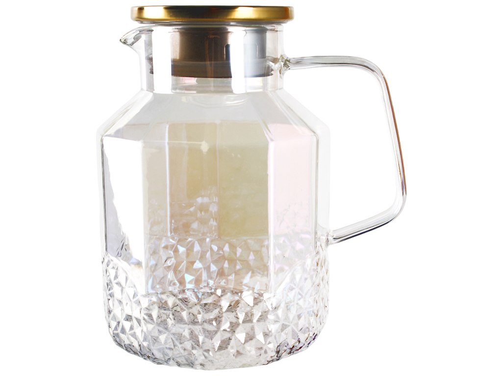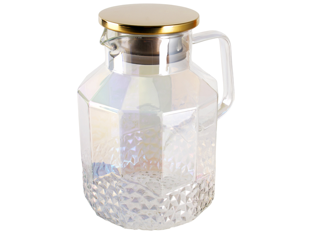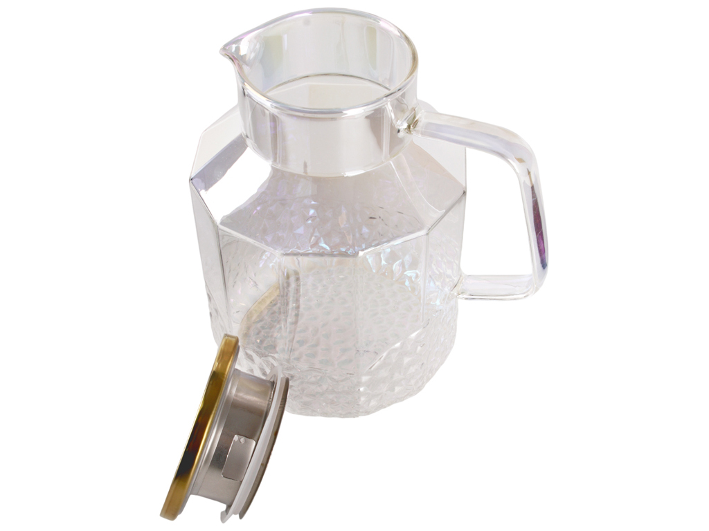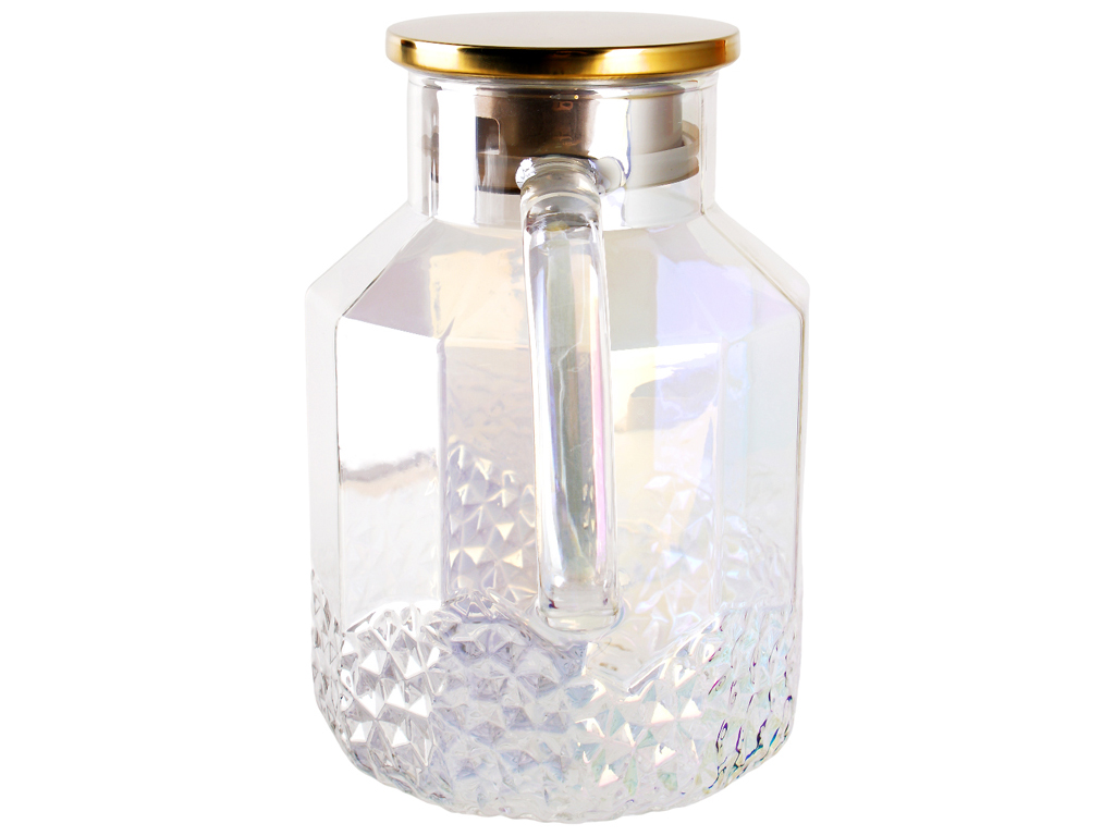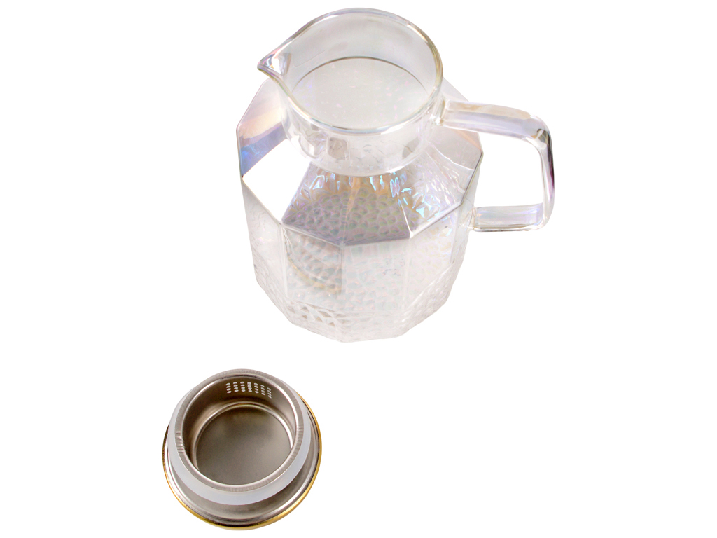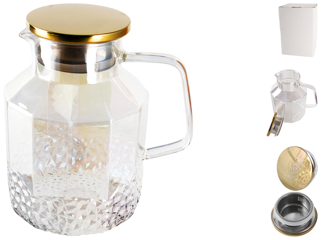 Стеклянный кувшин с фигурным дизайном и крышкой из нержавеющей стали, оснащенной силиконовым уплотнителем, идеально подходит для сервировки лимонада, чая или компота. Встроенный фильтр с ионным гипоаллергенным покрытием обеспечивает чистоту и свежесть напитков. Этот кувшин станет не только функциональным элементом вашего сервирования, но и прекрасным подарком для любителей уютных чаепитий и вкусных напитков. Нельзя использовать в микроволновой печи. Размеры (ДхШхВ): Коробка: 15х14,5х22см. Графин: диаметр крышки 9см, высота крышки 4см, диаметр горлышка 8см, ширина с ручкой 17см, высота с крышкой 20,5см, высота без крышки 19,5см, диаметр дна 14см.