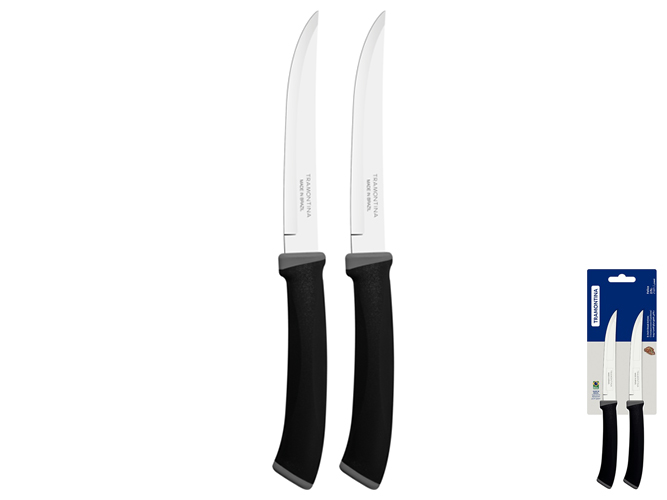 Набор ножей Tramontina Felice Black, для стейка, гладкий, 12,7см идеальные компаньоны в ваших ежедневных кухонных делах. Высококачественная нержавеющая сталь лезвия, надежные и эргономичные полипропиленовые ручки, выдерживающие высокие температуры, эти свойства обеспечивают долговечность использования, сочетаемую с исключительной силой разрезания пищевых продуктов. Количество в наборе: 2шт.