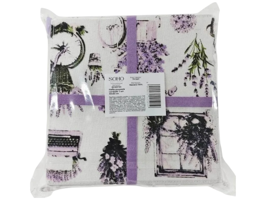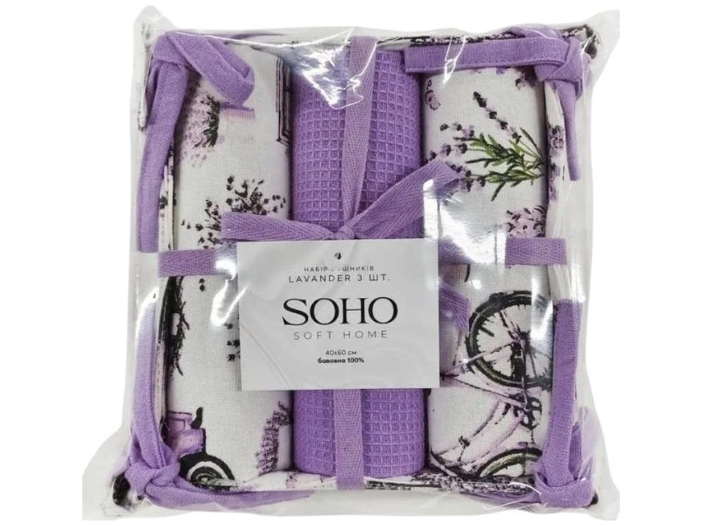Набор кухонных полотенец Soho Lavander украшен рисунком с лавандой и элементами прованского стиля. Полотенца изготовлены из 100% хлопка вафельного плетения с плотностью 170 г/м². Материал мягкий, приятный на ощупь, хорошо впитывает влагу и быстро сохнет. В комплект входят три полотенца — два с декоративным рисунком и одно однотонное сиреневое. Комплект станет не только практичным помощником на кухне, но и красивым элементом декора. Полотенца уложены в тканевую коробку с лентами, что делает набор готовым подарочным вариантом.