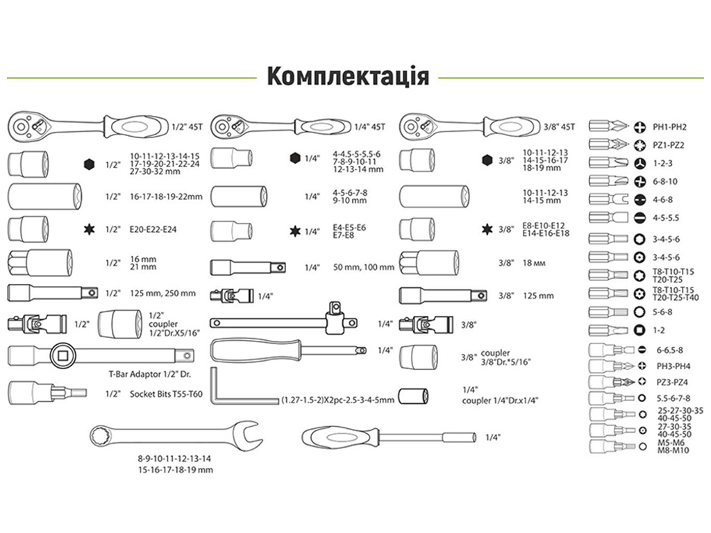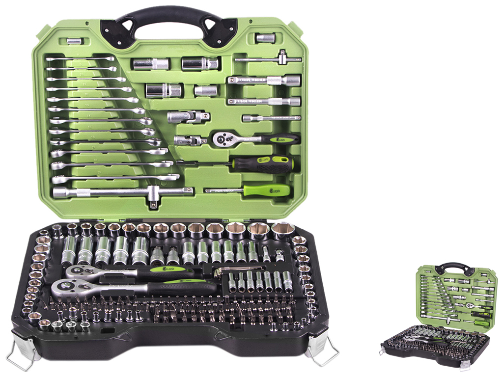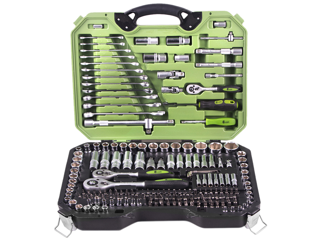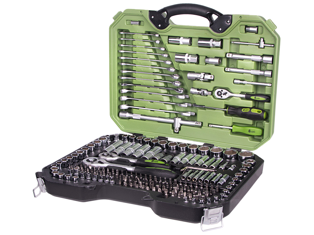 Набор инструмента универсальный Alloid в наборе содержится 218 единиц инструментов, которые позволяют выполнять большинство задач в автомастерской. В комплекте есть все необходимое для ремонта - от трещоток на квадраты 1/2" и 1/4" до большого выбора гаечных ключей, головок разных типов и бит. Головки изготовлены из высококачественной легированной хромованадиевой стали и имеют трехслойное покрытие. Инструмент способен выдержать большие нагрузки. Также, головки оборудованы компенсатором напряжения и легко очищаются благодаря зеркальной полировке поверхности. Набор отличается компактностью - все содержимое хранится в легком и удобном чемодане, изготовленном из ударопрочного пластика.
