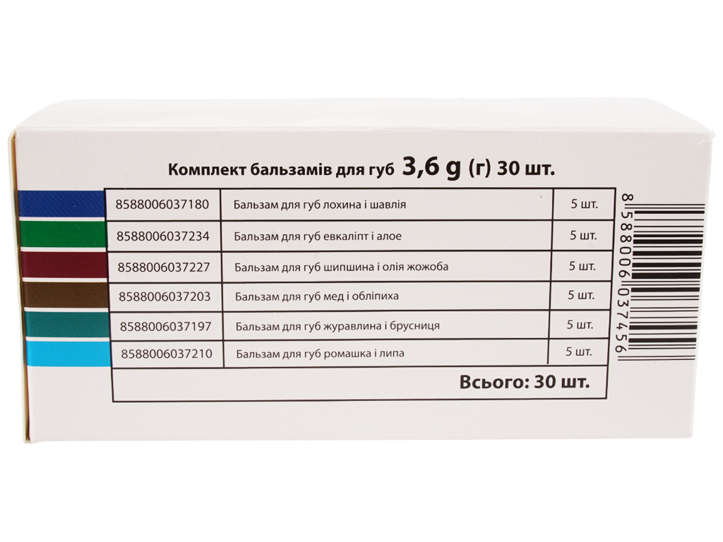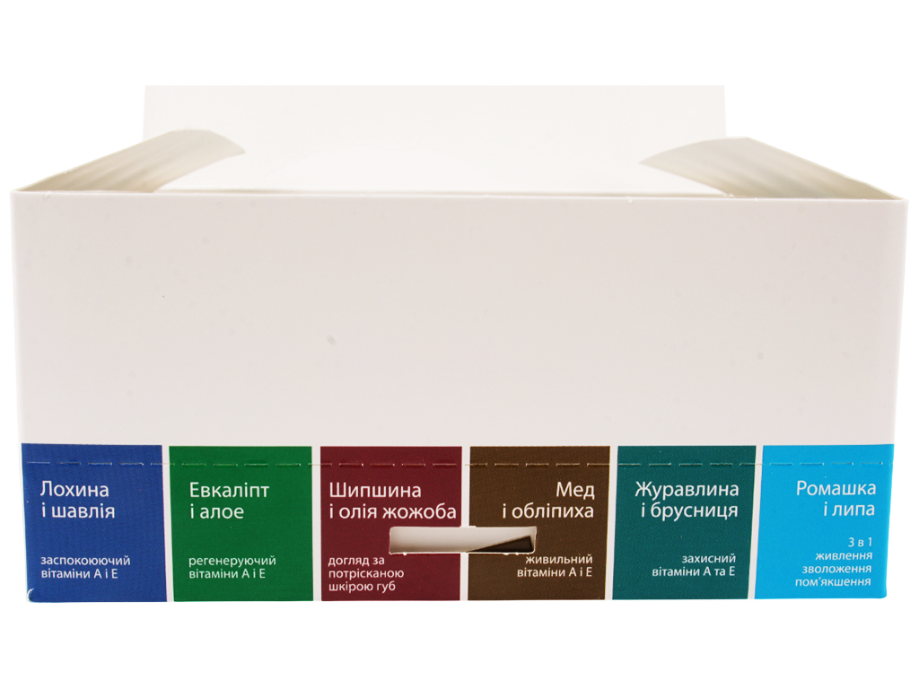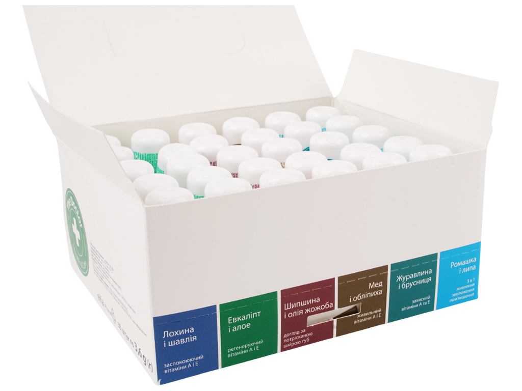 Набор гигиенических помад DD включает 30 стиков по 3,6 г с различными активными компонентами: черника и шалфей, эвкалипт и алоэ, шиповник и масло жожоба, мёд и облепиха, клюква и брусника, ромашка и липа. Помады содержат витамины A и E, обеспечивают питание, защиту и уход за губами в течение всего дня. Каждый стик имеет индивидуальный цвет корпуса по вкусу/композиции.