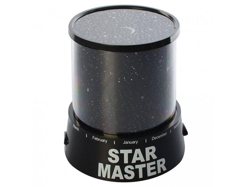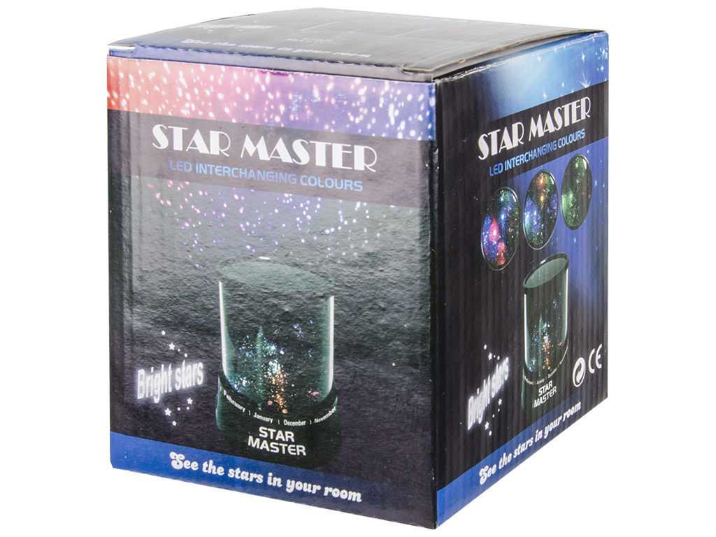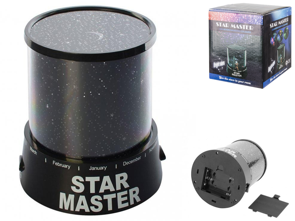 Размер: 11х11х11,5см. Ночник-проектор Star Master имитирует звездное небо, что позволит непринужденно осветить комнату. Прекрасно подойдет в качестве подарка ребенку, романтической особе или человеку, который боится темноты. На корпусе расположены 2 кнопки: STAR – включение, выключение ночника и режим постоянного свечения желтым; LED – включение, выключение ночника и режим мигания (красный + синий + зеленый). Также можно объединить два режима, одновременно нажав две кнопки. Питание: 3 батареи типа AA (нет в комплекте), кабель USB (есть в комплекте).