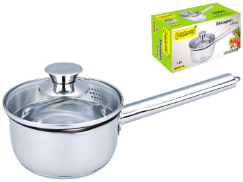 Ковш с крышкой D14см 1л. Шкала объема жидкости внутри изделия. Возможность использования в посудомоечной машине. Многослойное термоаккумулирующее дно. Материал: высококачественная нержавеющая сталь.