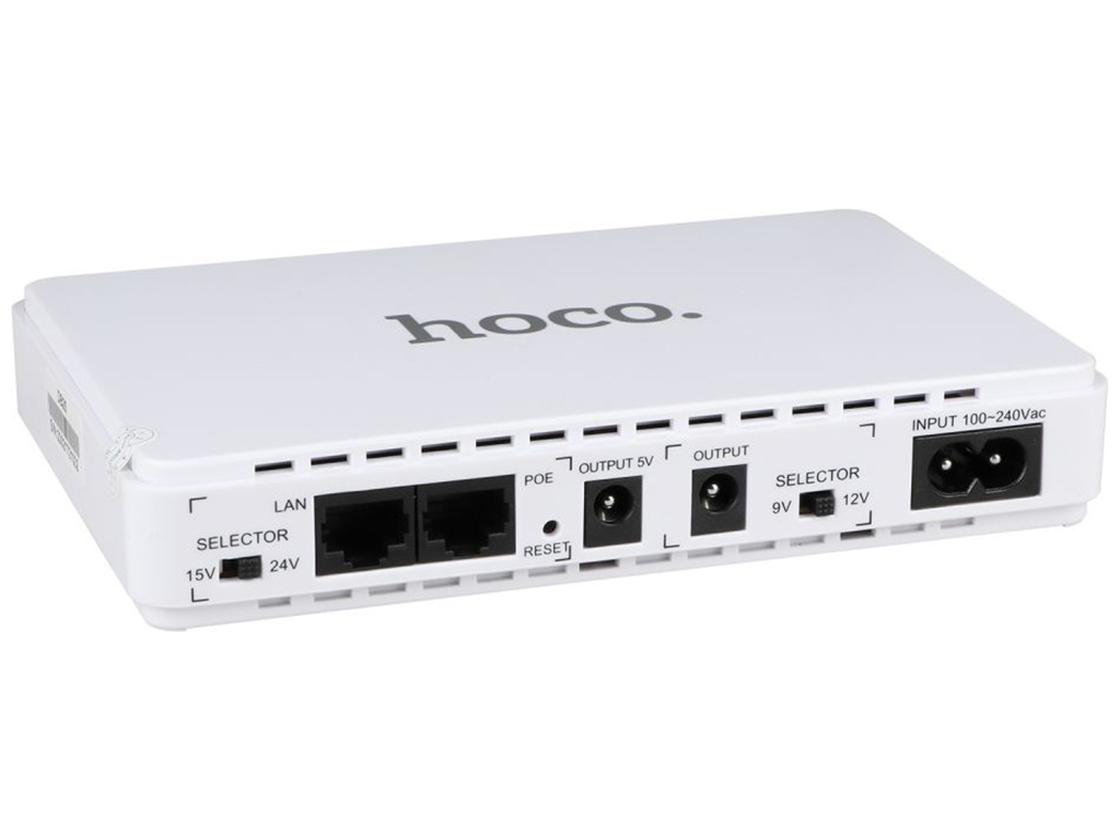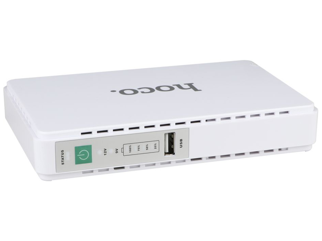 ?Источник бесперебойного питания Hoco DB25 UPS - это практичное устройство, которое обеспечит стабильную, беспрерывную подачу питания во время отключений электроэнергии. Данный аксессуар выделяется широкой функциональностью и совместимостью с огромным количеством современных стационарных девайсов и портативных гаджетов. Он может использоваться для зарядки смартфонов, планшетов, повербанков или беспроводных гарнитур, для питания ламп, увлажнителей воздуха, роутеров, модемов, систем видеонаблюдения и многих других устройств. Аксессуар выполнен в практичном, современном дизайне и имеет небольшие размеры. Его тонкий корпус надежно собран, изготовлен из ударостойкого пластика, дополнен вентиляционными отверстиями для отвода тепла. На его боковых гранях находятся: LED индикаторы для контроля уровня заряда и исходящего напряжения, кнопка включения, USB порт с исходящими слой тока 2А и напряжением 5В, пара портов Ethernet с поддержкой POE и напряжением 15 и 24В, DC разъем с исходящим напряжением 5В, DC разъем с напряжением на выходе 9 и 12В, разъем для подключения сетевого кабеля. Также, имеются кнопка "Reset" для Ethernet портов и индивидуальные переключатели напряжения для них и DC разъема. Модель оснащена многоуровневой системой защиты и функцией автоматического включения при отключении электричества. Емкость ее встроенного аккумулятора составляет 8800mAh.