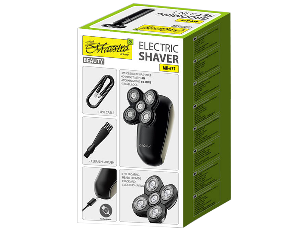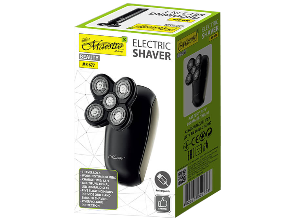 Литиевая батарея: 3,7 V 800 мАч. Пять плавающих головок обеспечивают быстрое и гладкое бритье. Водонепроницаемый корпус. Время зарядки: 1,5 часа. Время работы: 80 минут. Дорожная блокировка на дороге. Многофункциональный дисплей LED. Защита от перегрева. В комплекте: USB-кабель, щетка для чистки, бутылочка с маслом, ограничительный гребешок.