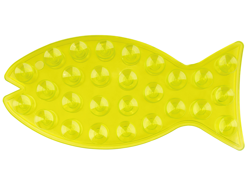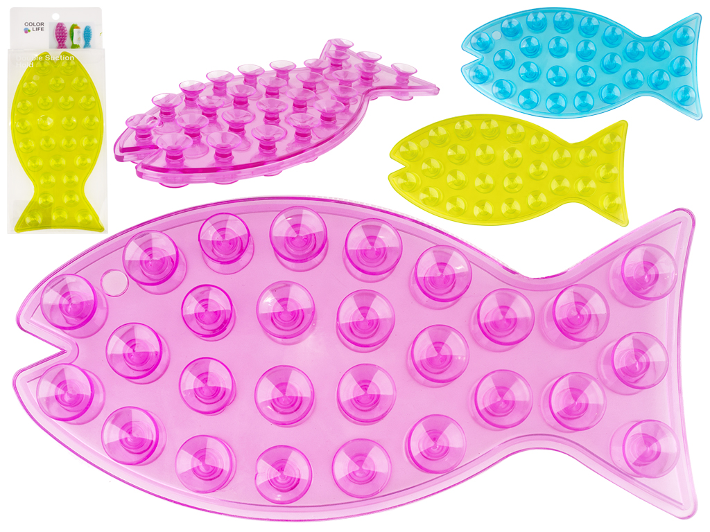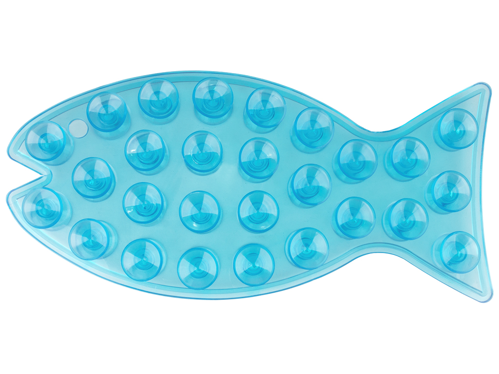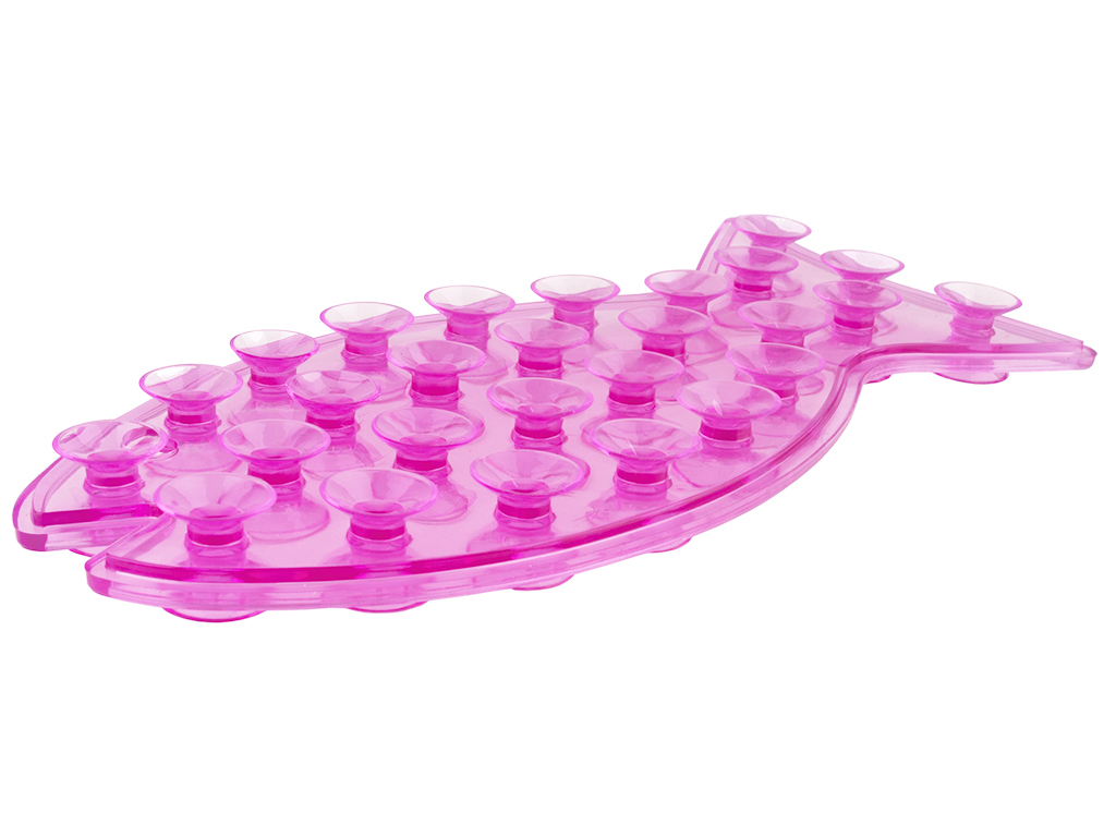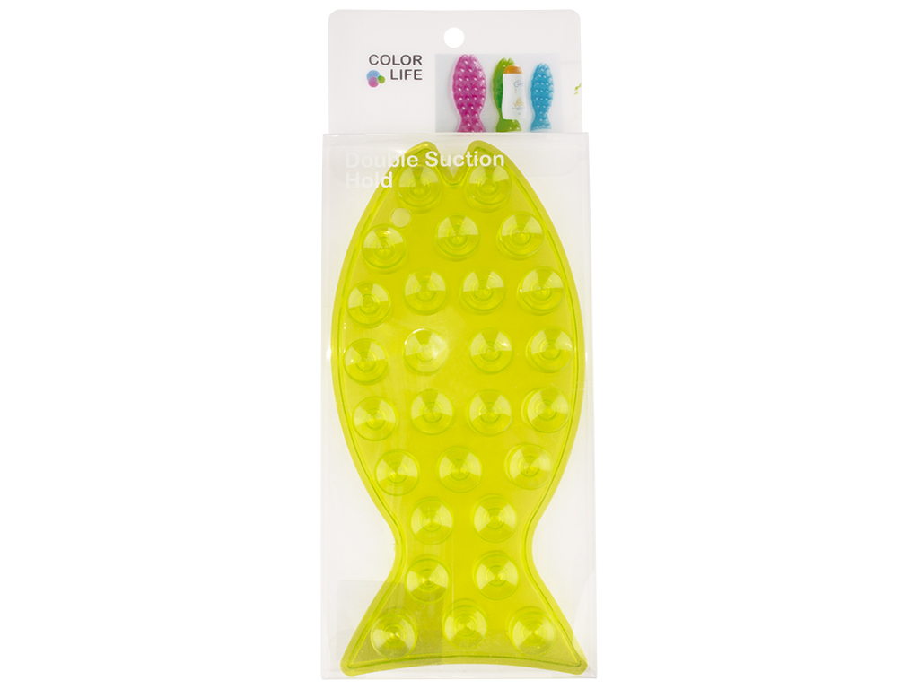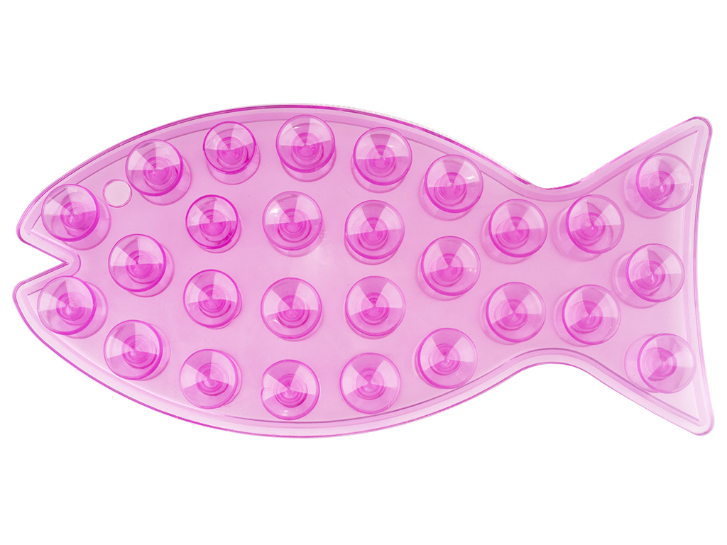 Размер: 20х1,5х9,3см. Цвета: розовый, голубой, салатовый. Силиконовый держатель в виде рыбы оснащен 27 присосками с каждой стороны. Одна сторона фиксируется к стене, на вторую можно прикрепить шампунь, гель для душа или кондиционер для волос. Держатель можно вешать на крючок за отверстие. Поставляется в прозрачной коробке ПВХ.