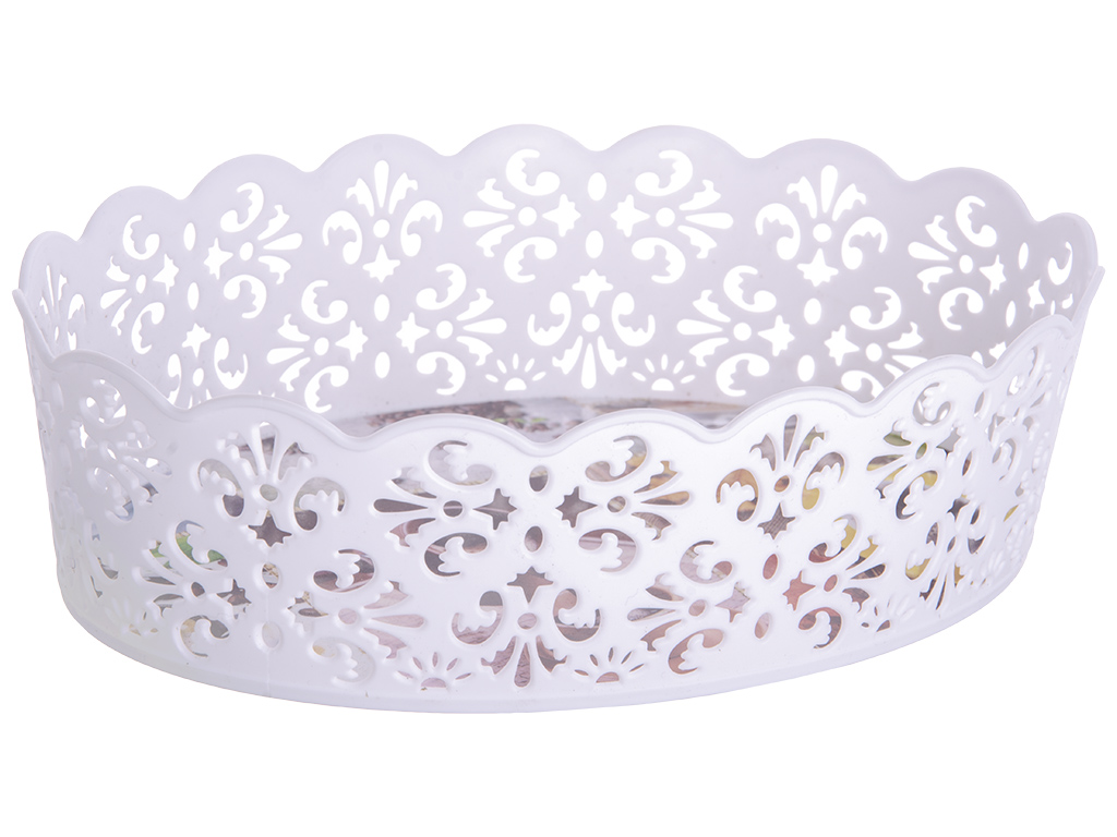 Размер: 21х15,8х6см. Материал: пластик. Упаковка: без индивидуальной упаковки. Расцветки ассорти (на дне внутри корзины нанесены красочные изображения), основной цвет пластика белый. Удобная, компактная корзина поможет организовать пространство. Подходит для хранения мелочей в ванной, сладостей на кухне, мелких инструментов на даче или в гараже. Влагоустойчева. Украшена ажурной перфорацией. Без крышки, без ручек.