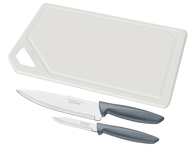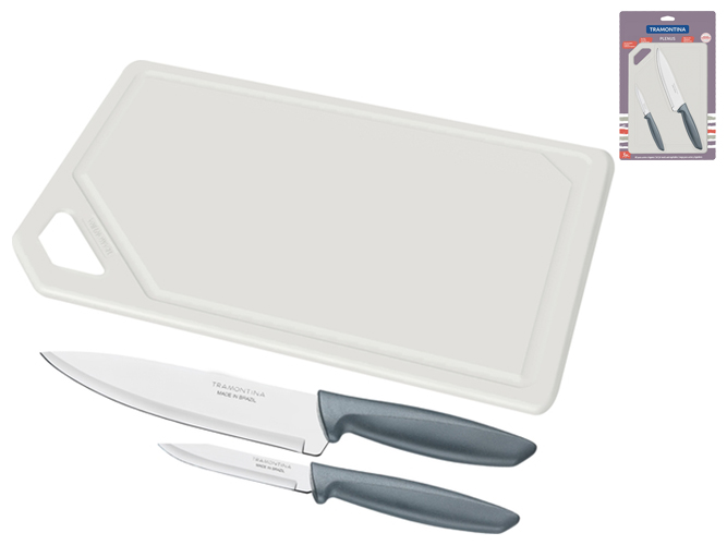 Набор ножей Tramontina Plenus grey, 3 предмета. Комплектация: нож Шеф 1шт-17,8см, нож для овощей 1шт-7,6см, пластиковая доска 1шт. Материал лезвия: нержавеющая сталь AISI 420. Материал рукоятки: полипропилен. Режущая кромка ножа: гладкая. Упаковка: индивидуальный блистер.