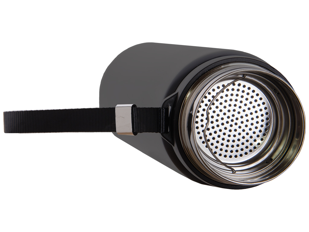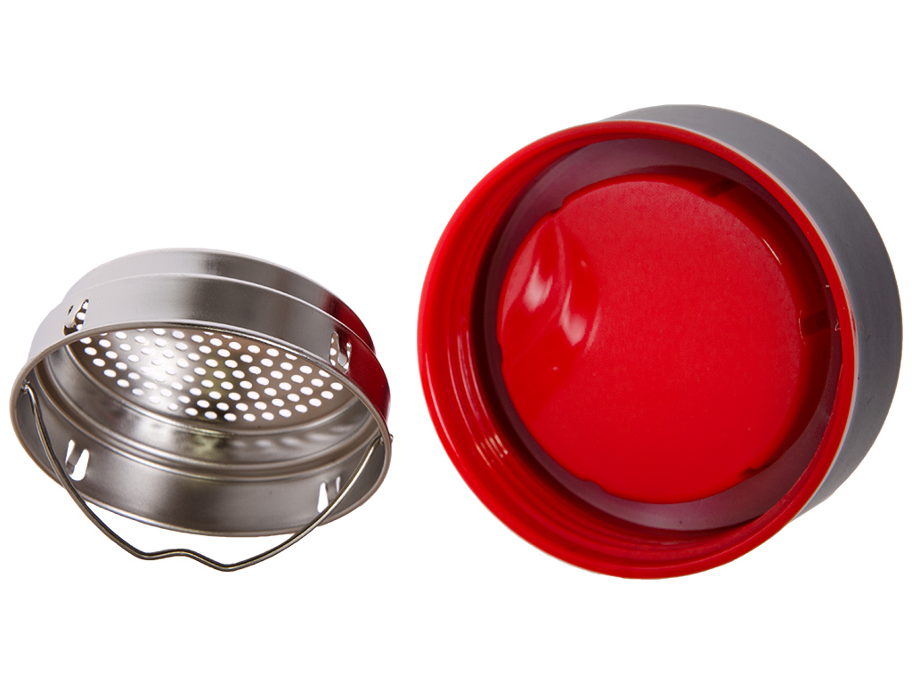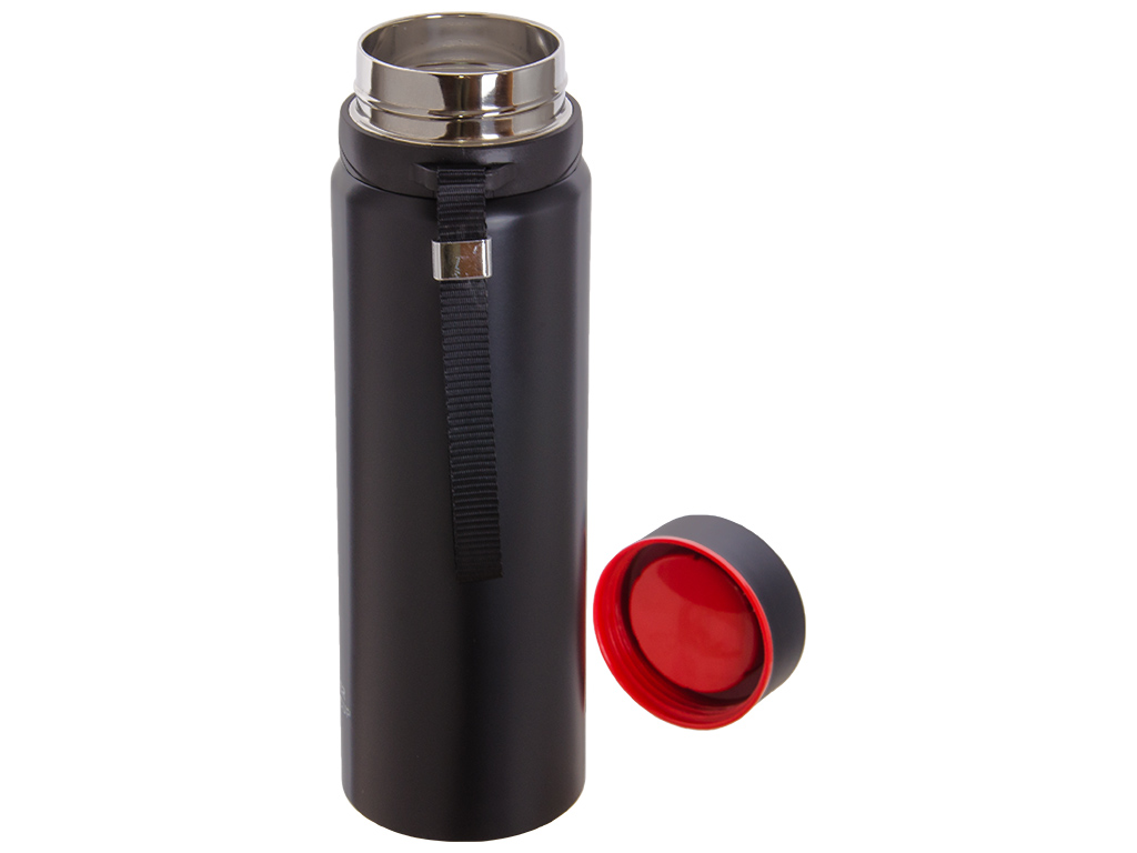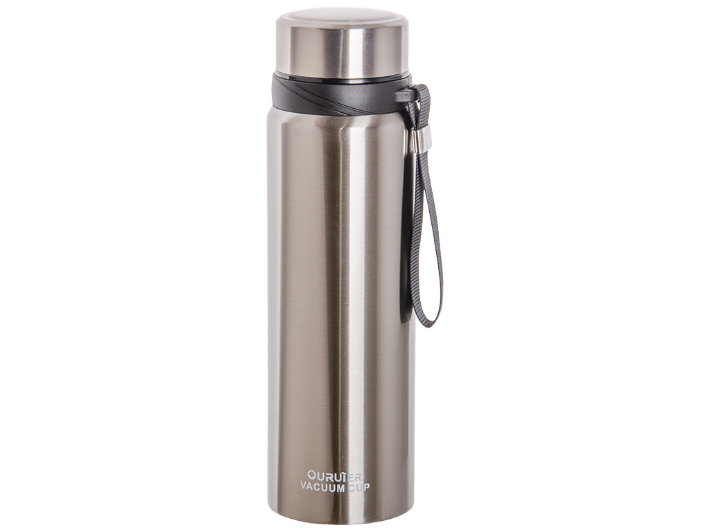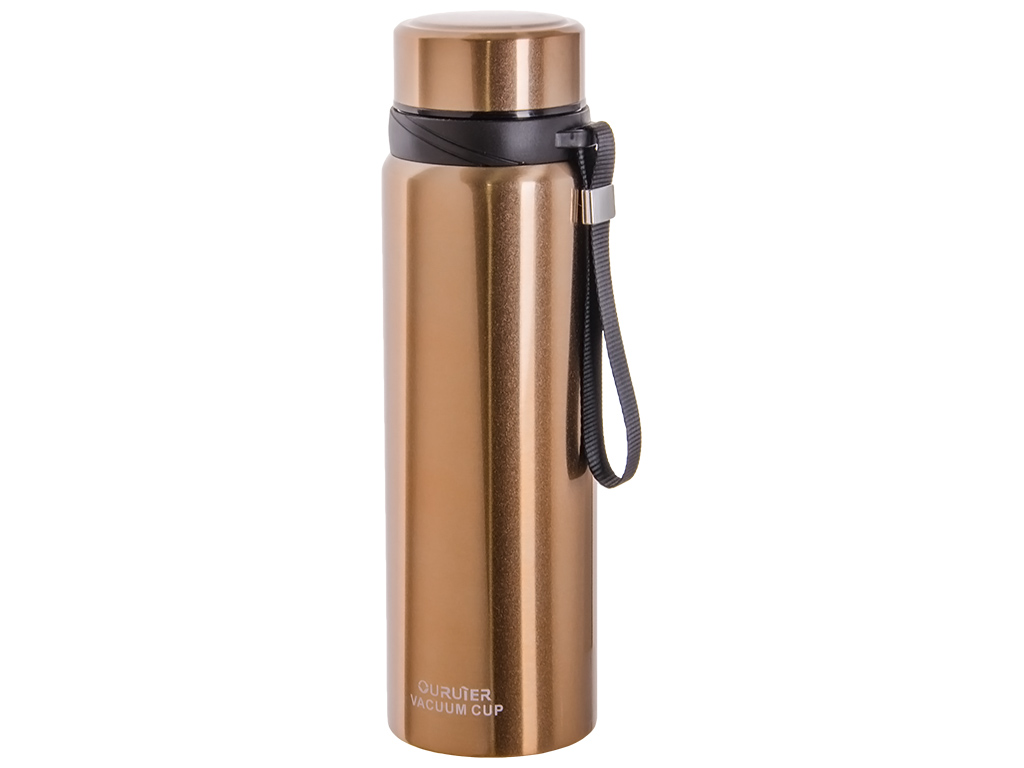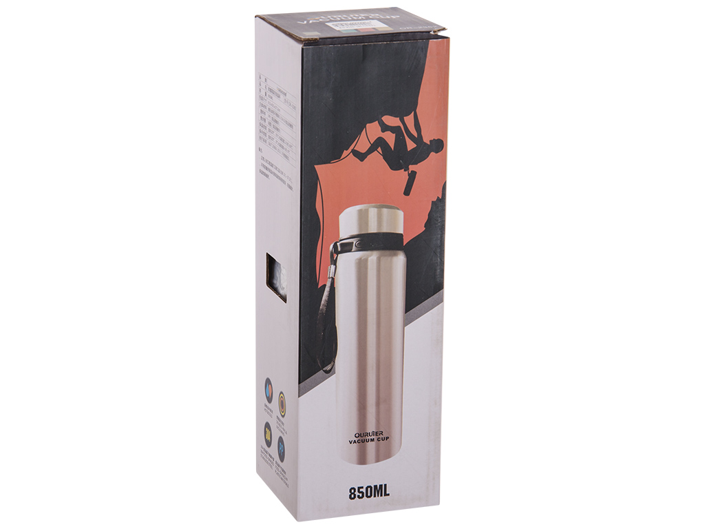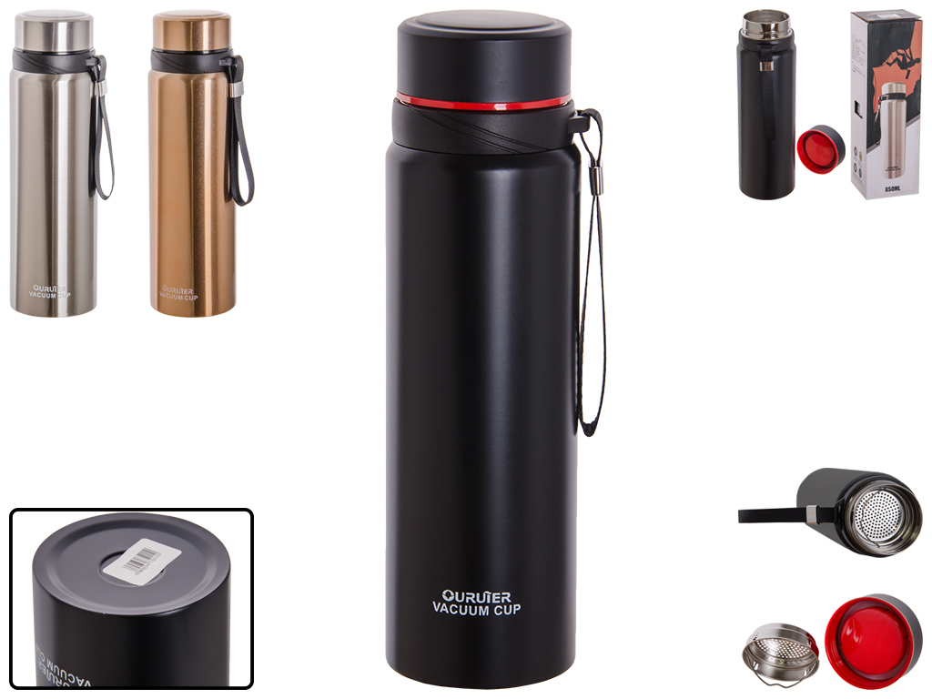 Размер: 8х8х26,5см. Объем, указанный на коробке: 850мл. Цвета: бронзовый, металлический, черный. Колба: нержавеющая сталь. Материал: нержавеющая сталь, пластик (основа крышки). Крышка закручивается на резьбу, оборудована пробкой с металлической поверхностью и силиконовым уплотнителем. Основа крышки из пластика, оболочка из нержавеющей стали. К термосу идет сито с ручкой, устанавливается внутрь горлышка. Дно термоса покрыто пластиком. Не использовать в микроволновой печи. Термос украшен рисунком. Поставляется в коробке, размер: 8,5х8,5х27см.