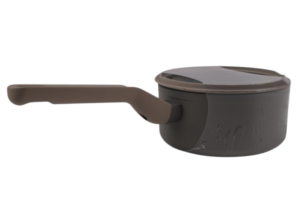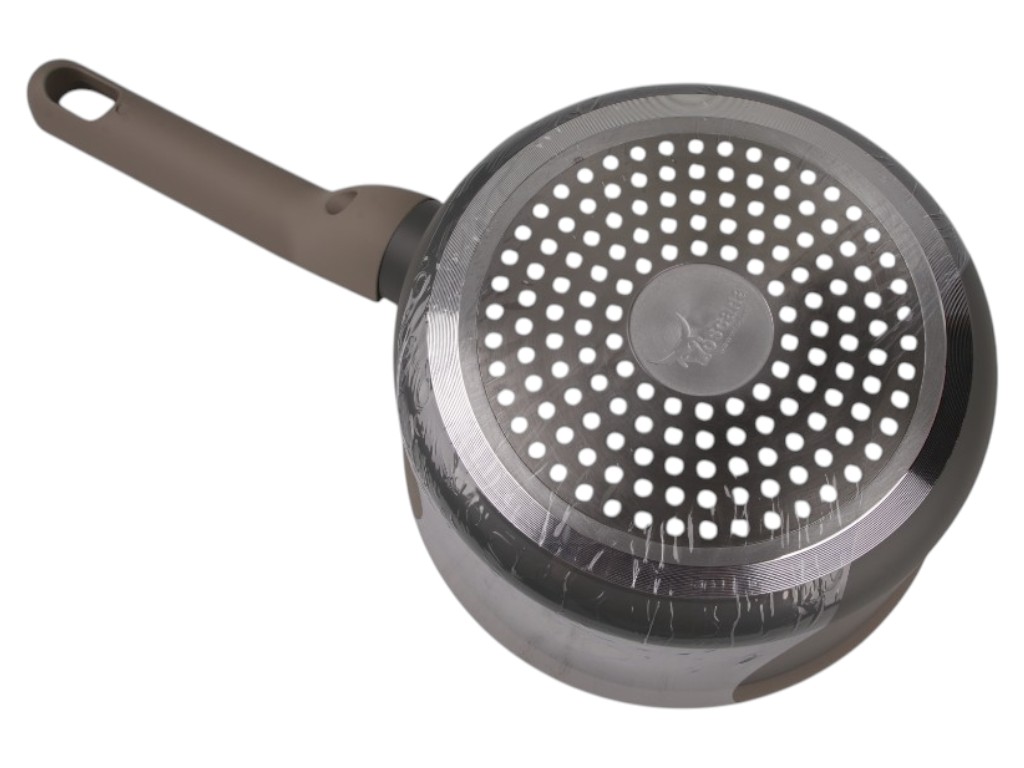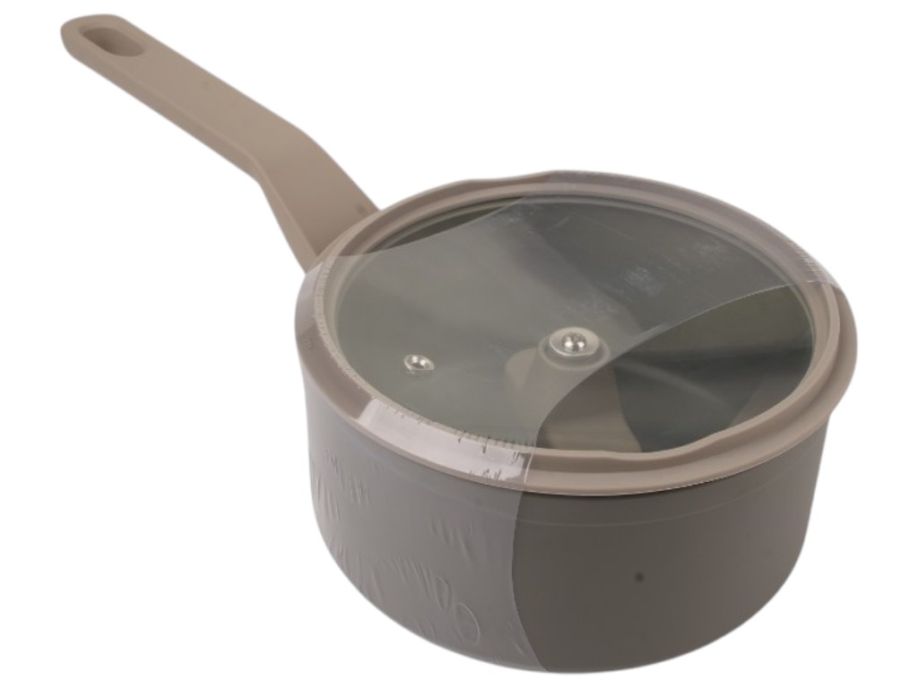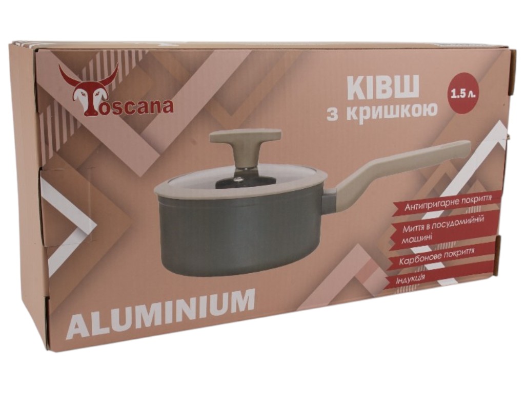 Ковш объёмом 1.5 литра выполнен из алюминия с антипригарным покрытием и укомплектован стеклянной крышкой с отверстием для выхода пара. Подходит для всех типов плит, включая индукционные. Диаметр по верху — 16.5см, высота без крышки — 7.5см, диаметр контактного дна — 12см. Внутреннее покрытие облегчает очистку после приготовления. Удобная ручка устойчива к нагреву, крышка плотно прилегает. Изделие поставляется в картонной упаковке.
