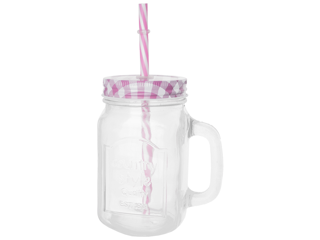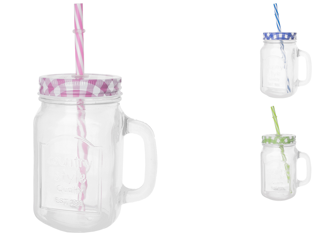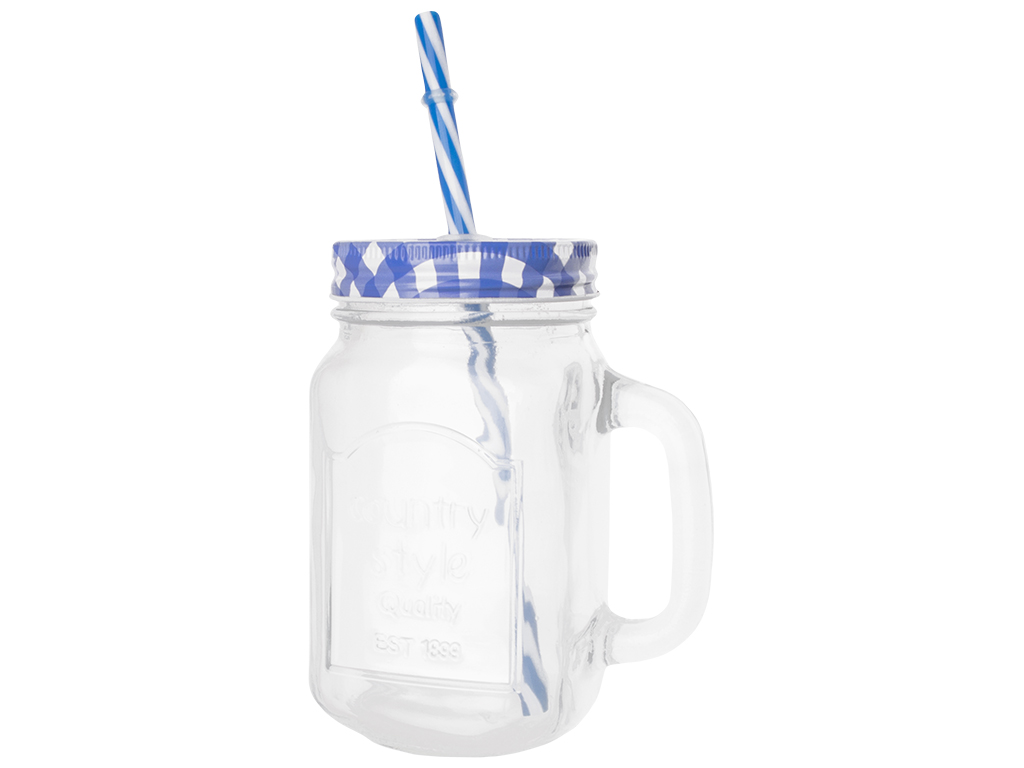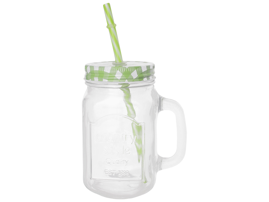 Чашка с ручкой, винтовой крышкой и трубочкой. Объем: 450мл. Размер банки без трубочки: 10,3х7,5х13,3см. С трубочкой: 10,3х7,5х19,5см. Диаметр трубочки: 0,7см. Длина трубочки: 18,8см. Материал: чашка - стекло, крышка - металл, трубочка - пластик. силиконовый уплотнитель в отверстии крышки. Расцветка крышек и трубочек: ассорти. Форма банки: прямоугольная. Материал: стекло, металл, пластик, силикон. Цвета ассорти. В середине крышки расположено отверстие для трубочки, которое уплотнено силиконовой вставкой для предотвращения пролития напитка. Банка-кружка используется для холодных и горячих напитков.