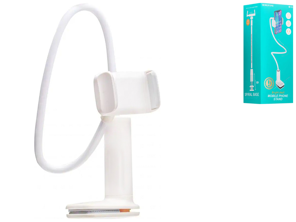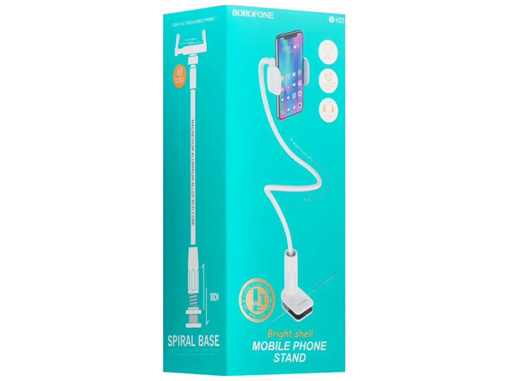 Держатель для смартфона Borofone BH23 - максимально комфортная модель для длительного пользования. Модель обеспечит максимальный комфорт использования мобильного телефона, может использоваться как дома, так и на работе, в офисе. Устройство реализовано в современном, оригинальном дизайне, что позволяет ему гармонично сочетаться с любым интерьером. Держатель изготовлен из качественного, прочного пластика с элементами из силикона и алюминиево-магниевого сплава. Раздвижная система со специальными накладками данной модели позволяет безопасно и надежно фиксировать смартфоны с диагональю от 4.5 до 6.5 дюймов. Диапазон ширины захвата - 54 -90мм. Эргономичная конструкция аксессуара с гибкой ножкой, имеющей длину 630 мм., поможет расположить закрепленный гаджет самым удобным образом. Для крепления держателя к горизонтальным поверхностям используется прочный зажим.