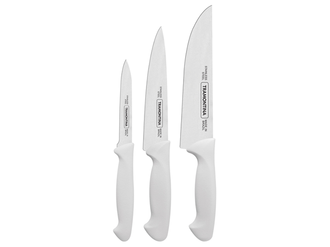 Набор ножей Tramontina Premium, 3шт. Материал лезвия: нержавеющая сталь AISI 420. Материал рукоятки: полипропилен. Комплектация набора: нож для чистки овощей-1шт (10,2см), нож универсальный-1шт (15,2см), нож для мяса-1шт (17,8см). Можно мыть в посудомоечной машине. Количество в наборе: 3шт.