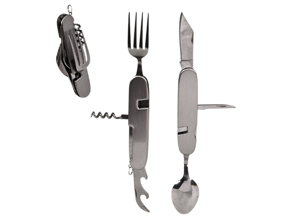 Мультитул сочетает в себе шесть практичных инструментов, необходимых в походных условиях. В конструкции предусмотрены ложка, вилка, два ножа, штопор и открывалка, что делает его удобным для приготовления и приема пищи, а также для открытия бутылок и консервов. Изготовлен из прочной нержавеющей стали, устойчивой к коррозии. Компактный размер позволяет носить мультитул в кармане или рюкзаке, что особенно полезно в путешествиях и на пикниках.