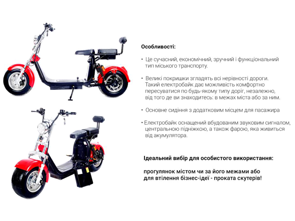 Универсальное транспортное средство, которое предназначено для передвижения по дорогам общего назначения и не требует обязательной регистрации, так как имеет двигатель мощностью 1500Вт. Работает данная модель от тягового свинцово-кислотного аккумулятора емкостью 20А*ч. Это позволяет преодолевать расстояния до 60км на одном заряде, при этом максимальная скорость скутера может составлять 70км/час. Такой транспорт идеально подойдет для передвижения как в городских условиях так и для езды по трассе, при этом не загрязняя окружающую среду. Максимальная грузоподъемность составляет 200кг. В скутере установлена передняя нерегулируемая амортизационная вилка, и задняя подвеска с двумя амортизаторами на пружинах, чего более чем достаточно для комфортной езды. Для контроля скорости и пройденного расстояния есть спидометр, а для езды в темное время суток установлены передние и задние фары, так же имеются поворотники. Данная модель имеет прямой привод. Скутер поставляется в разобранном виде.