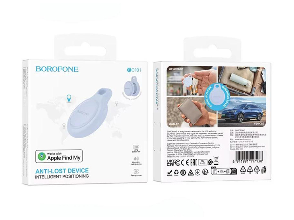 Устройство предназначено для отслеживания и поиска важных предметов с помощью высокоточного GPS модуля и совместимости с приложением Apple Find My network. Брелок выполнен из ABS пластика с ударостойким корпусом и оснащён удобной механической кнопкой для управления функциями. Borofone использует сменную литиевую дисковую батарейку стандарта CR2032, обеспечивающую длительное время работы. В комплект входят сам брелок, батарейка и крепление для фиксации на ключах, сумке или ошейнике.