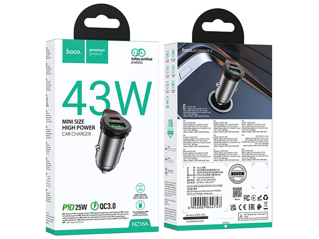 Авто Зарядное Устройство Hoco NZ16A 1USB-C/1USB QC/PD43W Цвет Серый