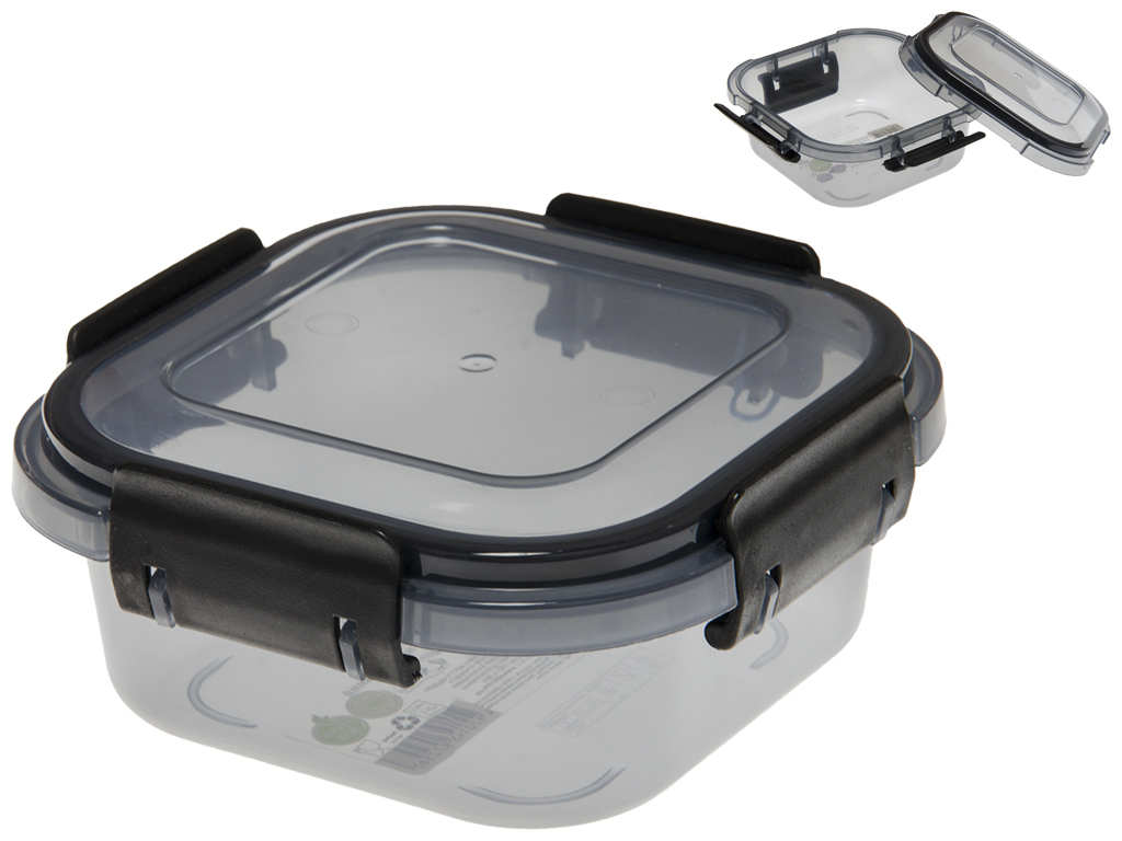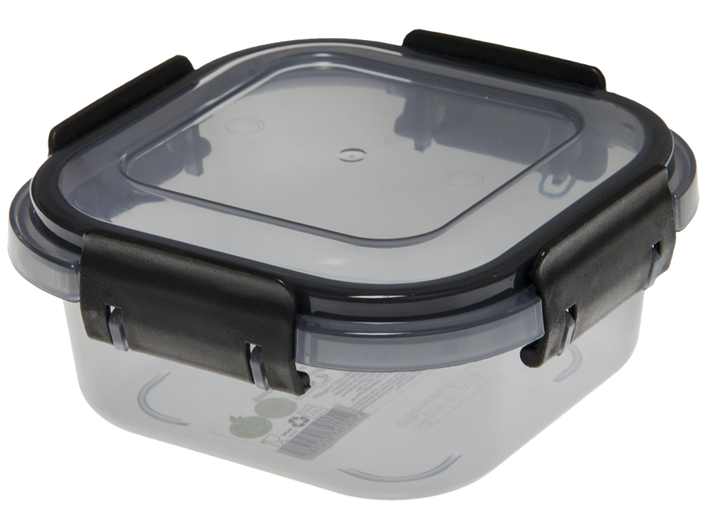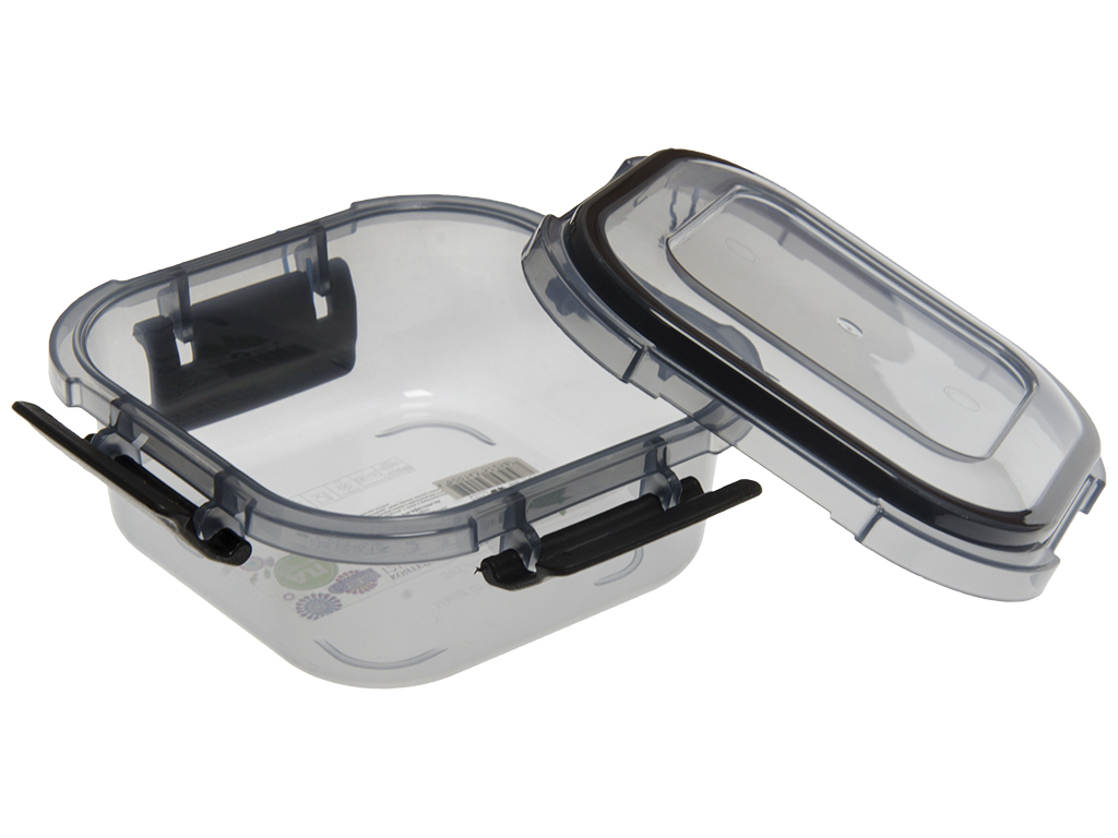 Размер контейнера: 12,1х12,1х5,2см. Объем: 360мл. Материал: полипропилен. Крышка закрывается на замки защелки с 4 сторон. Для плотного закрытия крышка оснащена силиконовым уплотнителем. Контейнер прозрачный слегка окрашен пищевым красителем темного цвета. Контейнер предназначен для пищевых продуктов и организации хранения. Без упаковки.