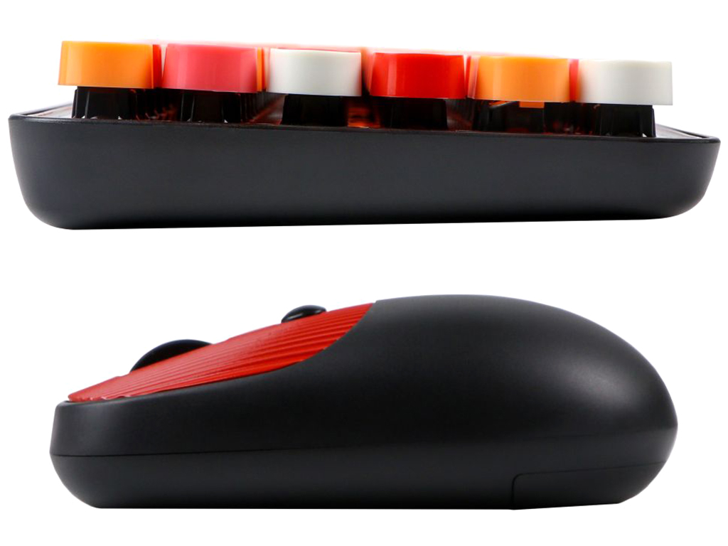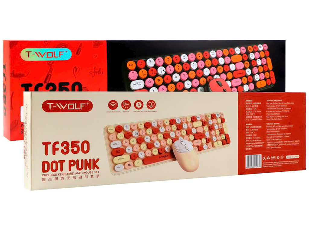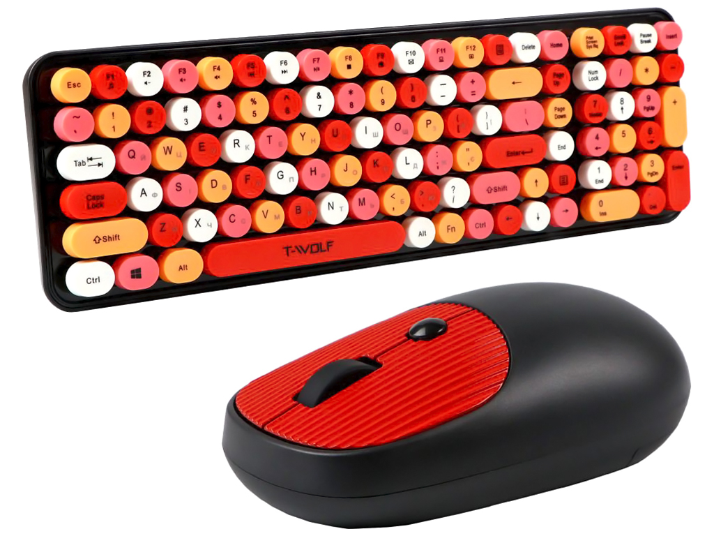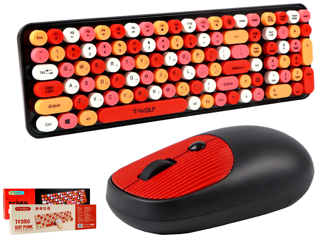 Беспроводная клавиатура и мышь TWolf TF350 Colorful – это стильный и функциональный комплект периферийных устройств, который придаст рабочему месту яркий и современный вид. Данный набор станет отличным дополнением к настольному ПК, может использоваться как дома, так и в офисе. Оба устройства выполнены в схожем дизайне с яркими, цветными кнопками, поэтому лаконично сочетаются друг с другом. Клавиатура привлекает внимание изысканным ретро стилем – круглыми колпачками клавиш как у настоящей печатной машинке. Она имеет небольшую толщину и достаточно компактные размеры, несмотря на наличие 105 кнопок. Её корпус защищён от воды и изготовлен из ударостойкого ABS-пластика. На ее нижней панели имеются противоскользящие накладки. Усовершенствованная мембрана клавиатуры обеспечивает приятный ход клавиш с отличным откликом. Колпачки кнопок имеют приятную на ощупь, слегка изогнутую поверхность. Символы на них чётко видны и не стираются длительное время.