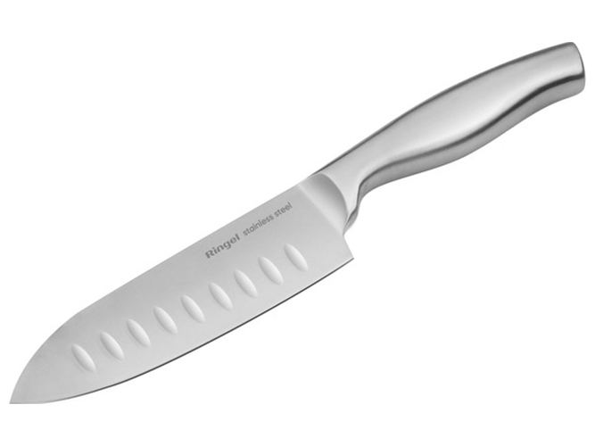 Нож Ringel Prime сантоку обладает высокой прочностью и корозостойкостью. Материал лезвия: нержавеющая сталь. Материал рукоятки: нержавеющая сталь. Режущая кромка ножа: гладкая. Цвет: стальной. Назначение ножа: сантоку. Твердость стали по шкале Роквелла - 53. Эргономичная ручка из нержавеющей стали с сатиновой полировкой. Длина лезвия: 12,7см.