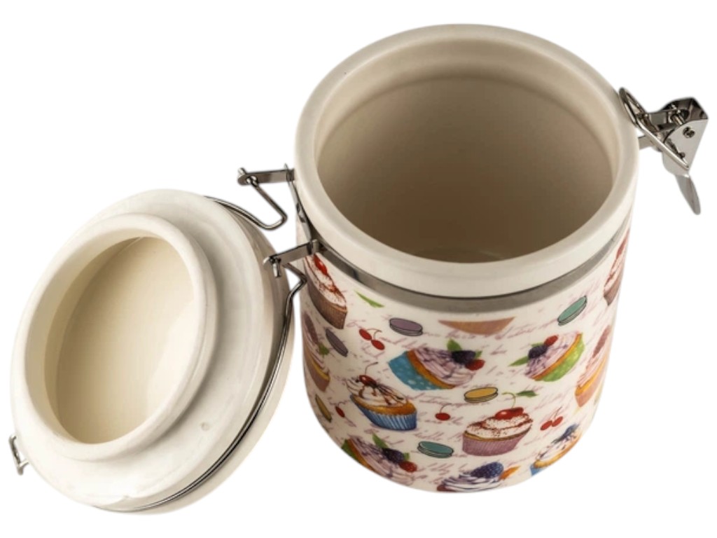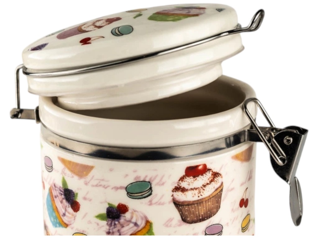 Керамическая емкость Десерт создана для удобного хранения различных сыпучих продуктов — от круп и сахара до чая, кофе и специй. Изделие имеет герметичную крышку с металлической защелкой, которая плотно прилегает к корпусу и помогает сохранять свежесть содержимого. Банка оформлена в ярком десертном дизайне с изображением пирожных, ягод и макаронс, что придает кухне уют и настроение домашнего тепла. Емкость выполнена из прочной керамики с гладким покрытием, устойчивым к влаге и запахам. Внутренняя поверхность легко очищается, не впитывает красящие вещества и подходит для регулярного использования. Банку удобно использовать как для хранения, так и для сервировки — она украсит открытую полку, кофейный уголок или стол в столовой. Размер емкости универсален — в нее помещается около 500 мл содержимого, чего достаточно для чая, сахара или небольших порций круп. Крышка открывается плавно, металлический фиксатор работает надежно, создавая аккуратный внешний вид. Емкость можно сочетать с другими предметами в аналогичном стиле, создавая гармоничный комплект кухонных аксессуаров.