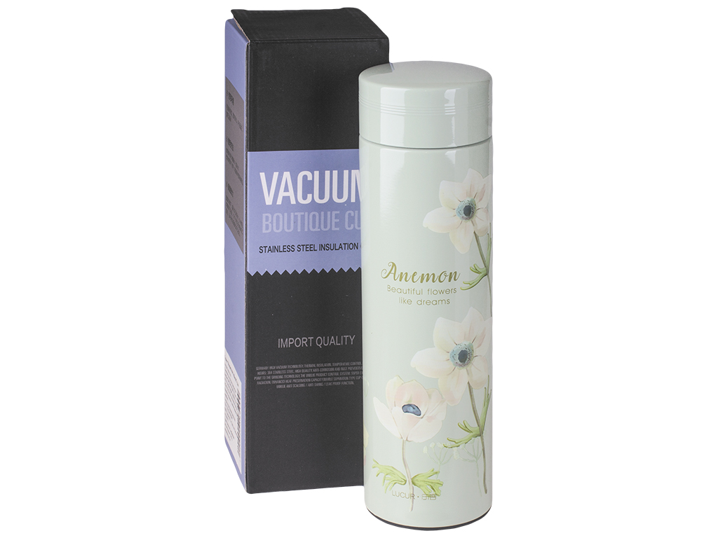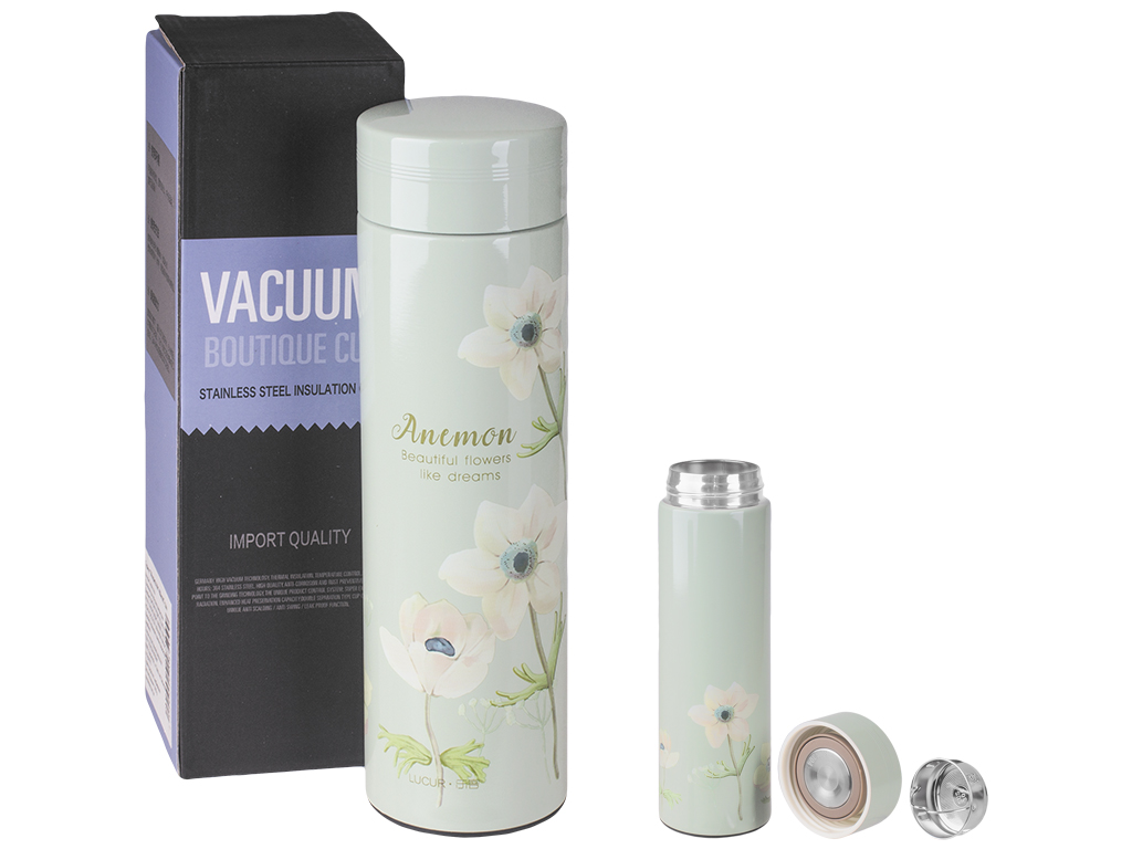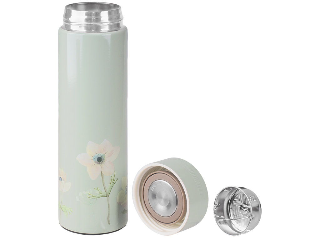 Размер: 6,5х6,5х22,8см. Объем, указанный на коробке: 450мл. Объем по замерам: рекомендованный для использования 420мл. Колба: нержавеющая сталь. Материал: нержавеющая сталь, пластик (основа крышки). Крышка закручивается на резьбу, оборудована пробкой с металлической поверхностью и силиконовым уплотнителем. Основа крышки из пластика, оболочка из нержавеющей стали. К термосу идет сито с ручкой, устанавливается внутрь горлышка. Дно термоса покрыто пластиком. Не использовать в микроволновой печи. Термос украшен рисунком. Поставляется в коробке.